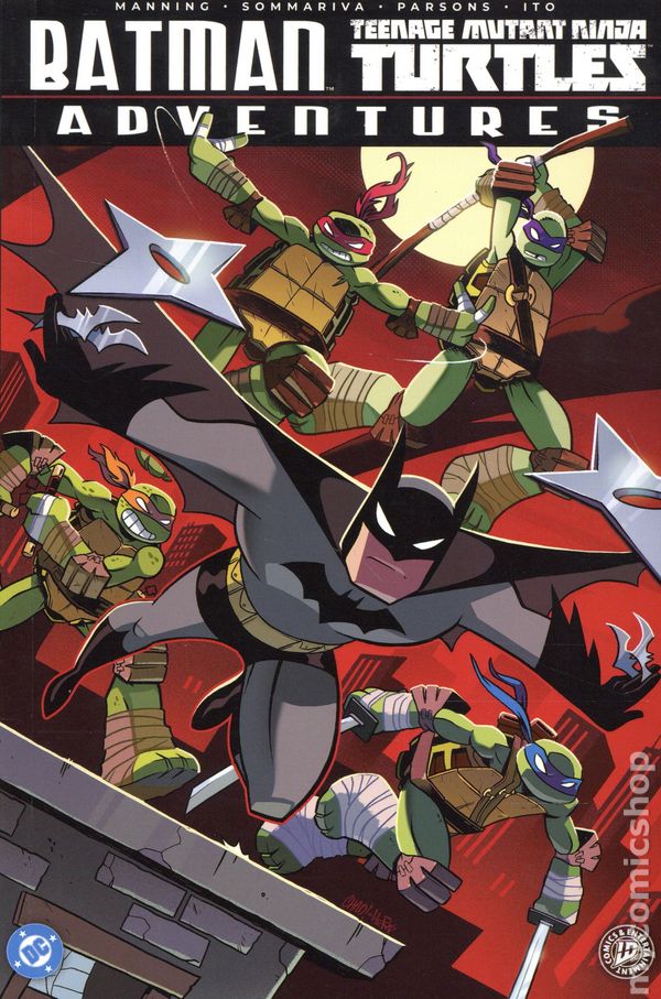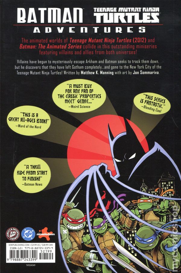 2nd Edition - 1st printing. Collects Batman/Teenage Mutant Ninja Turtles Adventures (2016 IDW) #1-6. Written by Matthew K. Manning. Art by Jon Sommariva and Serge LaPointe. Cover by Chad Thomas. Back Cover by Ken Haese. The animated worlds of the 2012 Teenage Mutant Ninja Turtles Nickelodeon cartoon and Batman: The Animated Series collide in this outstanding miniseries featuring villains and allies from both universes! In this new pocket sized edition (6" x 9") of the 2017 series, villains start to mysteriously escape Arkham and Batman seeks to track them down, but he discovers that they have left Gotham completely... and gone to the New York City of the Teenage Mutant Ninja Turtles! Softcover, 6-in. x 9-in., 144 pages, full color. Cover price $21.99.