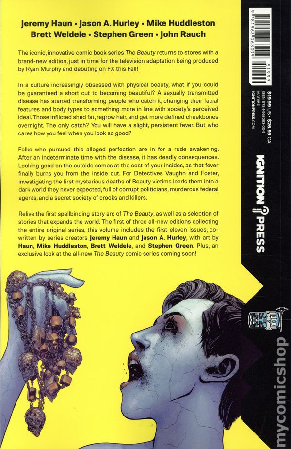 Volume 1 - 1st printing. Collects The Beauty (2015 Image) #1-11. Written by Jeremy Haun and Jason A. Hurley. Art by Stephen Green, Brett Weldele, and Mike Huddleston. Cover by Jeremy Haun. The iconic, innovative comic book series The Beauty returns to stores with a brand new edition, just in time for the television adaptation being produced by Ryan Murphy and debuting on FX in this Fall! In a culture increasingly obsessed with physical beauty, what if you could be guaranteed a short cut to becoming beautiful? A sexually transmitted disease has started transforming people who catch it, changing their facial features and body types to something more in line with societys perceived ideal. Those inflicted shed fat, regrow hair, get more defined cheekbones overnight. The only catch? You will have slight, persistent fever. But who cares how you feel when you look so good? Folks who pursued this alleged perfection are in for a rude awakening. After an indeterminate time with the disease, it has deadly consequences. Looking good at the outside comes at the cost of your insides, as that fever finally burns you from the inside out. For Detectives Vaughn and Foster, investigating the first mysterious deaths of Beauty victims leads them into a dark world they never expected, full of corrupt politicians, murderous federal agents, and a secret society of crooks and killers. Relive the first spellbinding story arc of The Beauty, as well as a selection of stories that expands the world. The first of three all-new editions collecting the entire original series, this volume includes the first eleven issues, co-written by series creators Jeremy Haun and Jason A. Hurley, with art by Haun, Mike Huddleston, Brett Weldele, and Stephen Green. Softcover, 272 pages, full color. Mature Readers Cover price $19.99.