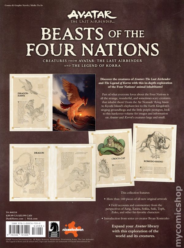 1st printing. Discover the creatures of Avatar: The Last Airbender and The Legend of Korra with this in-depth exploration of the Four Nations' animal inhabitants! Part of what everyone loves about the Four Nations is all the strange and wonderful (and sometimes scary!) creatures that inhabit them! From the Air Nomads' flying bison, to Kyoshi Island's elephant koi, to the Earth Kingdom's singing groundhogs and the little purple pentapus, look to this hardcover volume for images and information on Avatar and Korra's creatures large and small. Hardcover, 9 1/2-in. x 12-in., 128 pages, full color. Cover price $39.99.