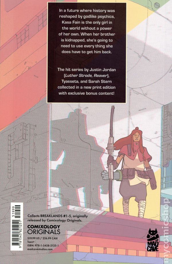 Volume 1 - 1st printing. "The Chase!" Written by Justin Jordan. Art and cover by Tyasseta. In a future where history was reshaped by godlike psychics, Kasa Fain is the only girl in the world without a power of her own. When her brother is kidnapped, she's going to need to use every thing she does have to get him back. The ht series by Justin Jordan (Luther Strode, Reaver), Tyasseta, and Sarah Stern collected in a new print ediion with exclusive bonus content! Collects BREAKLANDS #1-5, originally released by Comixology Originals. Softcover, 128 pages, full color. Teen+ Cover price $19.99.