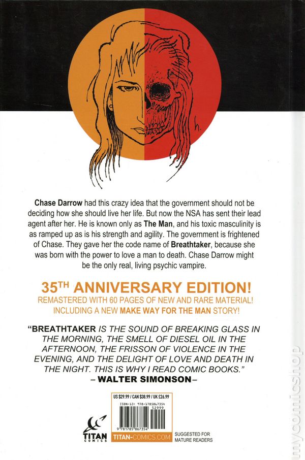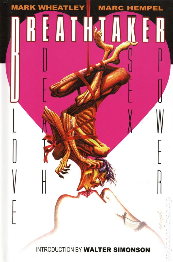 1st printing. Collects Breathtaker (1990 DC) #1-4. Written by Mark Wheatley. Art and cover by Mark Wheatley and Marc Hempel. Introduction by Walt Simonson. FROM INKPOT AWARD WINNERS MARK WHEATLEY AND MARC HEMPEL In Breathtaker, all love withers and dies... but for Chase Darrow, it is literally the kiss of death! Chase Darrow is a beautiful weapon. The US government gave her a sexual power that makes her utterly alluring - the perfect weapon for espionage. Yet to kiss a man leaves his lifeforce drained and means that no one can love her without paying the ultimate price. Includes never before seen comic! MAKE WAY FOR THE MAN and an introduction by award-winning comics creator Walter Simonson (Thor, Star Wars, Elric). Hardcover, 276 pages, full color. Mature Readers Cover price $29.99.