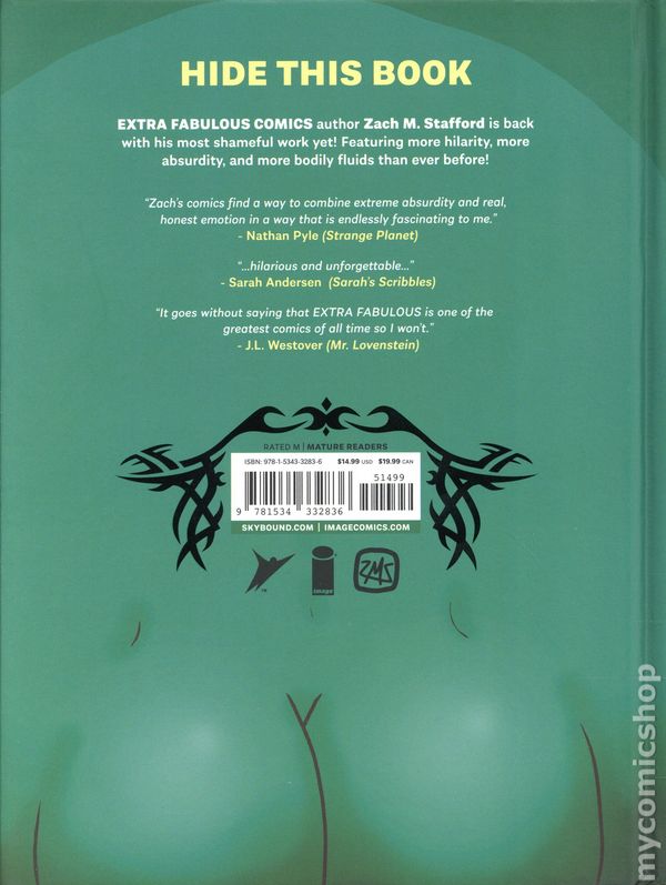 1st printing. Story and art by Zach Stafford. SHAME...WE ALL FEEL IT! EVERY DAY! ALL THE TIME...RIGHT? Embrace your dark, shameful nature with 192 pages of the best (and worst) Extra Fabulous comics of all time, including print-exclusive, never-before-seen comics. Warning: This book contains references to many bodily fluids, so its best to lay down a tarp before reading. Webcomics master ZACH M. STAFFORD presents his most shameful work of all time in THE BOOK OF SHAME: AN EXTRA FABULOUS COLLECTION, the sopping wet follow-up to his graphic novel debut! Hardcover, 6 1/4-in. x 8 1/4-in., 192 pages, full color. Mature Readers Cover price $14.99.