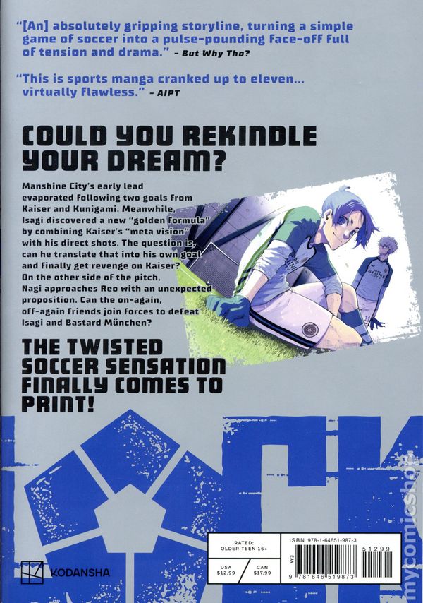 Volume 22 - 1st printing. Written by Muneyuki Kaneshiro. Art and cover by Yusuke Nomura. A mad young coach gathers soccer players from across the country to compete in a series of bizarre challenges in a high-tech colosseum he calls Blue Lock. It's a no-balls-barred battle to become Japan's next top striker, in this Squid Game–meets–World Cup manga, now available in print! Anime airing now! COULD YOU REKINDLE YOUR DREAM? Manshine City's early lead evaporated following two goals from Kaiser and Kunigami. Meanwhile, Isagi discovered a new "golden formula" by combining Kaiser's "meta vision" with his direct shots. The question is, can he translate that into his own goal and finally get revenge on Kaiser? On the other side of the pitch, Nagi approaches Reo with an unexpected proposition. Can the on-again, off-again friends join forces to defeat Isagi and Bastard München? Softcover, 5 1/2-in. x 8-in., 208 pages, B&W. Older Teen 16+ Cover price $12.99.