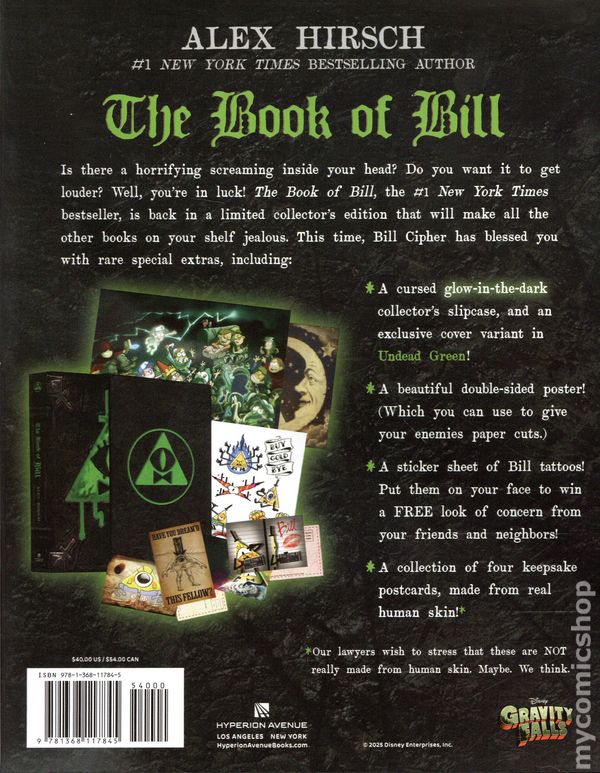 1st printing. By Alex Hirsch. Is there a horrifying screaming inside your head? Do you want it to get louder? Well, youre in luck! The Book of Bill, the #1 New York Times bestseller, is back in a limited collectors edition that will make all the other books on your shelf jealous. This time, Bill Cipher has blessed you with rare special extras, including: A cursed glow-in-the-dark collectors slipcase, and an exclusive cover variant in Undead Green! A beautiful double-sided poster! A sticker sheet of Bill tattoos! A collection of four keepsake postcards! Beware: This book travels to dimensions meant for older readers. Hardcover (with Slipcase), 10 1/2-in. x 8-in., full color. Cover price $40.00.