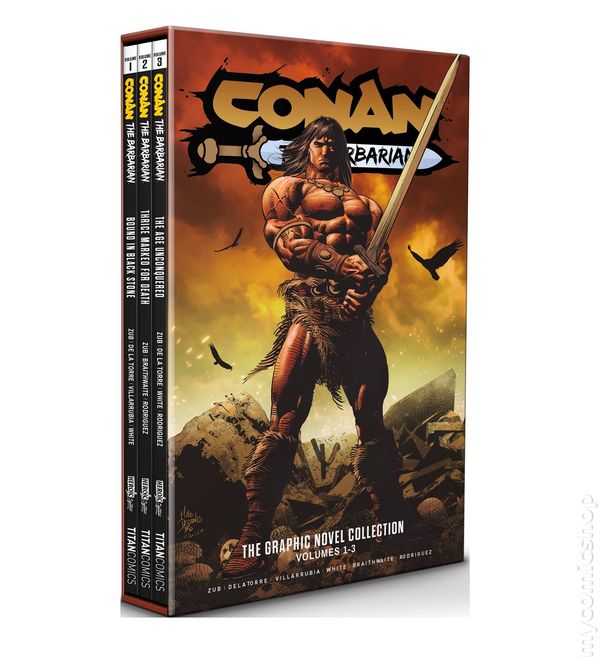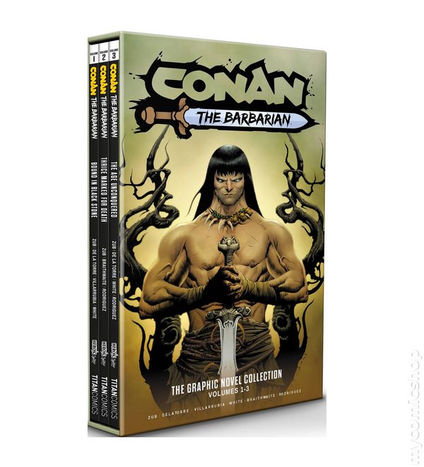 Includes Vol. 1 -3 (with Slipcase)- Printings May Vary. Written by Jim Zub. Art by Roberto de la Torre. Cover by Mike Deodato. THE FIRST THREE ACTION-PACKED VOLUMES OF CONAN THE BARBARIAN'S NEW ERA OF COMICS COLLECTED FOR THE FIRST TIME. Armed with just his wits and his sword, Conan sets out for the first time from his beloved Cimmeria and after adventures on the high seas, he returns to shore to find himself haunted by his memories of Bêlit, captain of the Tigress and Queen of the Black Coast. Then, sent back in time to the Thurian Age, Conan battles terrifying creatures and meets Kull the Conqueror, a barbarian-king as strong as himself! Softcover (3 Volumes with Slipcase), 352 pages (Total), full color. Mature Readers Cover price $49.99.