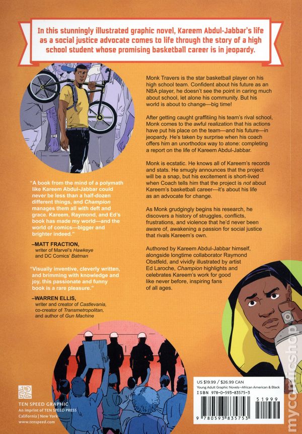 1st printing. Written by Kareem Abdul-Jabbar and Raymond Obstfeld. Art and cover by Ed Laroche. In this stunningly illustrated graphic novel, Kareem Abdul-Jabbar's life as a social justice advocate comes to life through the story of a high school student whose promising basketball career is in jeopardy. Monk Travers is the star basketball player on his high school team. Confident about his future as an NBA player, he doesnt see the point in caring much about school, let alone his community. But his world is about to change—big time! After getting caught graffitiing his team's rival school, Monk comes to the awful realization that his actions have put his place on the team—and his future—in jeopardy. Hes taken by surprise when his coach offers him an unorthodox way to atone: completing a report on the life of Kareem Abdul-Jabbar. Monk is ecstatic. He knows all Kareems records and stats. He smugly announces that the project will be a snap, but his excitement is short-lived when Coach tells him that the project is not about Kareems basketball career—its about his life as an advocate for change. As Monk grudgingly begins his research, he discovers a history of struggles, conflicts, frustrations, and violence that hed never been aware of, awakening a passion for social justice that rivals Kareems own. Authored by Kareem Abdul-Jabbar himself, alongside longtime collaborator Raymond Obstfeld, and vividly illustrated by artist Ed Laroche, CHAMPION highlights and celebrates Kareems work for good like never before, inspiring fans of all ages. Softcover, 128 pages, full color. All Ages Cover price $19.99.