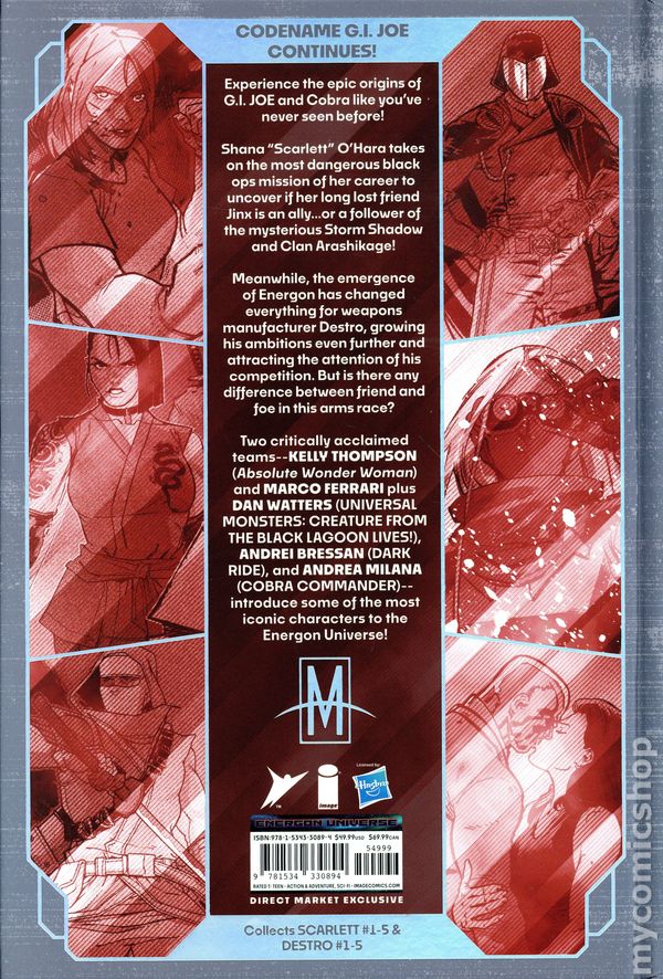 Volume 2 - 1st printing. Collects Scarlett (2024 Image) #1-5 and Destro (2024 Image) #1-5. Written by Kelly Thompson and Dan Watters. Art by Andrei Bressan, Andrea Milana, and Marco Ferrari. Cover by Marco Ferrari. THE ROAD TO G.I. JOE CONCLUDES HERE! Experience the origins of G.I. Joe and Cobra in the ENERGON UNIVERSE in a new deluxe format! Shana Scarlett OHara takes on the most dangerous black ops mission of her career to uncover whether her long lost friend Jinx is an ally...or a follower of the mysterious Storm Shadow and Clan Arashikage! Meanwhile, the emergence of Energon has changed everything for Destro, as an arms race heats up with his fiercest competition. Is Destros new alliance with Cobra Commander doomed from the start? Two critically acclaimed teams—KELLY THOMPSON** (Absolute Wonder Woman, Birds of Prey) and **MARCO FERRARI **(FRONTIERSMAN), plus DAN WATTERS (UNIVERSAL MONSTERS: CREATURE FROM THE BLACK LAGOON LIVES!), ANDREI BRESSAN (DARK RIDE), and ANDREA MILANA (COBRA COMMANDER), introduce some of the most iconic characters in pop culture to the Energon Universe! Hardcover, 7 1/2-in.x 11-in., 248 pages, full color. Teen Cover price $49.99.