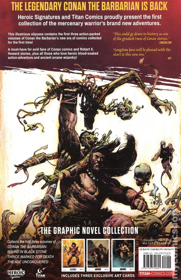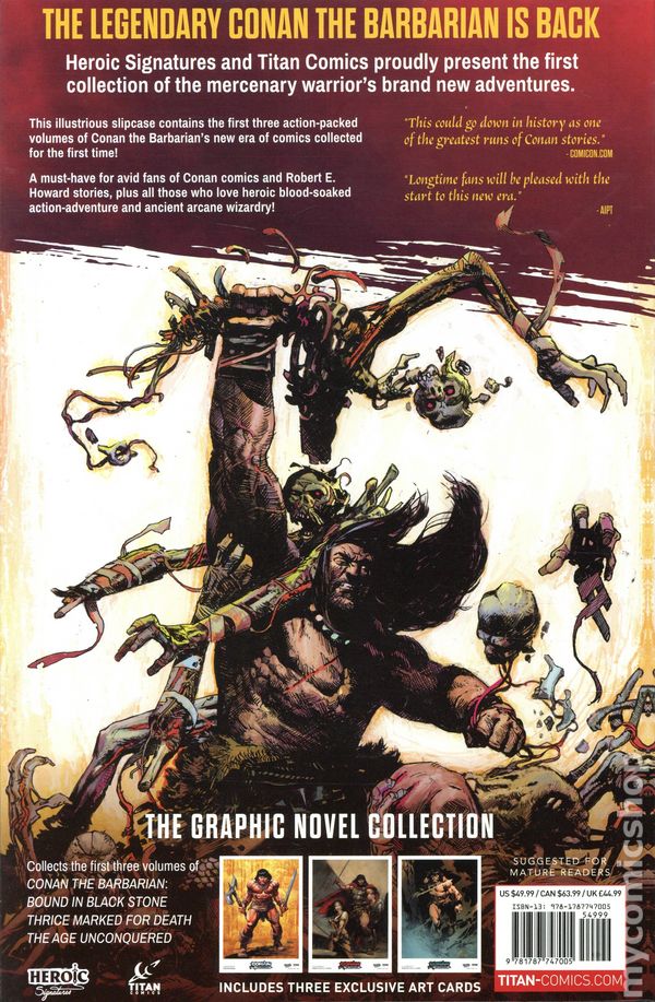 Includes Vol. 1 -3 (with Slipcase)- Printings May Vary. Written by Jim Zub. Art by Roberto de la Torre. Cover by Jae Lee. THE FIRST THREE ACTION-PACKED VOLUMES OF CONAN THE BARBARIAN'S NEW ERA OF COMICS COLLECTED FOR THE FIRST TIME. Armed with just his wits and his sword, Conan sets out for the first time from his beloved Cimmeria and after adventures on the high seas, he returns to shore to find himself haunted by his memories of Bêlit, captain of the Tigress and Queen of the Black Coast. Then, sent back in time to the Thurian Age, Conan battles terrifying creatures and meets Kull the Conqueror, a barbarian-king as strong as himself! Softcover (3 Volumes with Slipcase), 352 pages (Total), full color. Mature Readers Cover price $49.99.