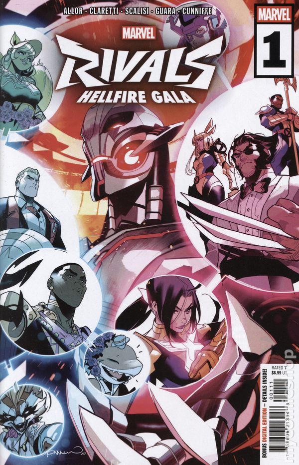 Written by Paul Allor. Art by Luca Claretti; Daniel Scalisi; Ig Guara. Cover by Simone Di Meo. INTERDIMENSIONAL PARTY CRASHERS?! When the Krakoa of the timestream-entangled world of Marvel Rivals throws a Hellfire Gala, the heroes of the Multiverse assemble in the finery to wine and dine the night away. But who invited Ultron? Answer: No one - but he's not observing decorum! The living machine has set his sights on Cerebro, the device holding the archive of all mutant DNA and the key to their resurrection protocol! Can the heroes hold back his waves of drones and save the most precious relic of mutantkind? Can the heroes decide on the best course of action? And will Squirrel Girl, Jeff, Rocket and the Thing make it to the battle or just hang out at their private beach party on the Krakoan shores? All will be revealed within! 48 pages, full color. Rated T Cover price $6.99.