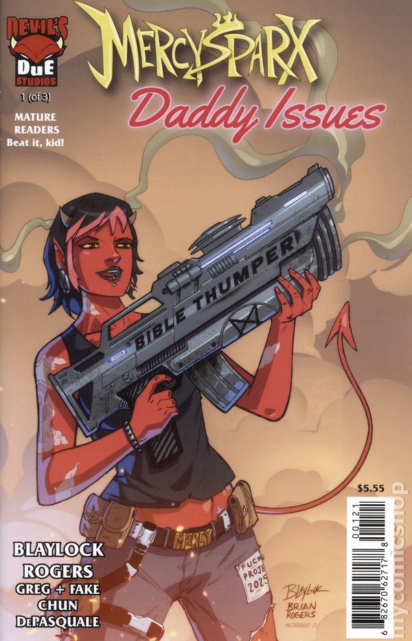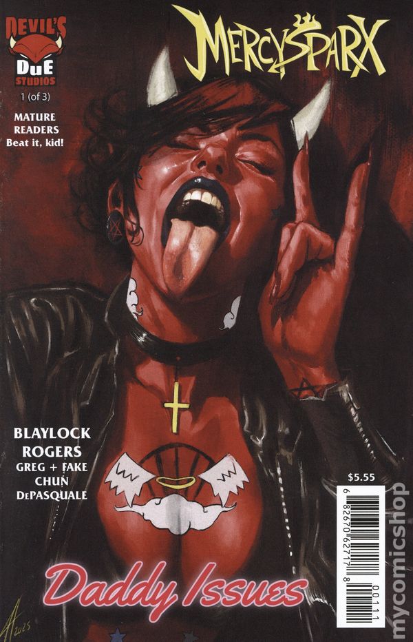 Written by Josh Blaylock. Art by Josh Blaylock, Brian Rogers. Cover by Josh Blaylock, Briand Rogers. Mercy's angel hunting days are behind her, but old wounds open thanks to problems caused by the father figures who raised her, and the chaotic, messy flings and crushes of her past that came later. Chief among them - Father Kael Donavon, the priest with a tortured past and an uncanny understanding of exorcisms, forged through his own childhood possession.Picking up directly after the plot-twisting events of of No More Angels Left to Fall, Daddy Issues reminds Mercy that running from her past is not an option - she must confront it. 24 pages, full color. Rated M Cover price $5.55.
