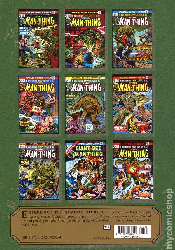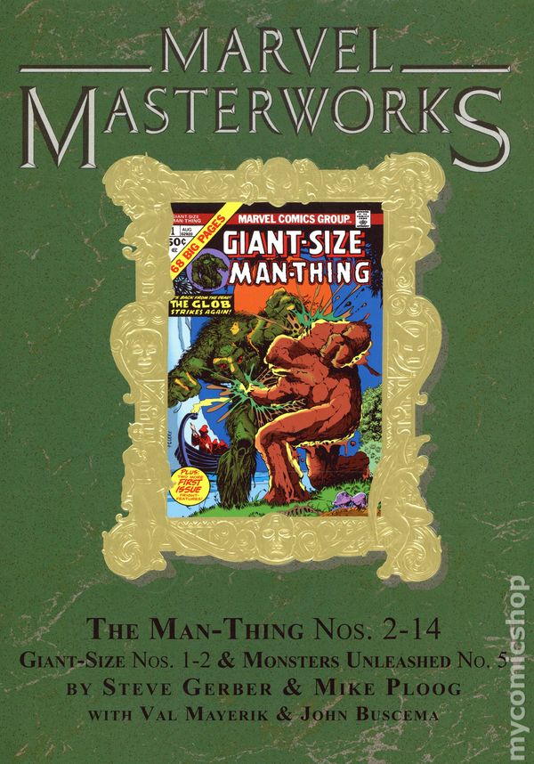 Volume 385 - 1st printing. "The Man-Thing: Book 2!" Collects The Man-Thing (1974 1st Series) #2-14, Giant Size Man-Thing (1974) #1-2 and material from Monsters Unleashed (1973) #5. Written by Steve Gerber, Mike Ploog, and Tony Isabella. Art by Mike Ploog, Val Mayerik, John Buscema, Alfredo Alcala, Vincente Alcazar, Sal Tarpani, Jack Abel, Frank Chiaramonte, Klaus Janson, and Tom Sutton. Cover by Mike Ploog. Introduction by J.M. DeMatteis. The Marvel Masterworks boast an all-new restoration that makes these stories look better than ever! A rotten swamp monster never looked so good! Artist Mike Ploog joins writer Steve Gerber, and they'll have you turning pages to shuffle through the muck and loving every second of it. Gerber's stories continue to expand the strange world surrounding the Man-Thing - and the people, both helpful (Richard Rory) and hateful (F.A. Schist), who have been drawn into the monster's orbit. Of course, there's also top-notch, good-ol'-fashioned fighting. Who wouldn't want to see the Man-Thing and the Glob swinging fists? Do they even have fists? It doesn't matter, it's comic-book perfection. Meanwhile, the Foolkiller debuts, and Man-Thing is hauled to New York City where Reed Richards is left to wonder whether there's still a man inside the mire! Hardcover, 360 pages, full color. Rated T+ Cover price $75.00.