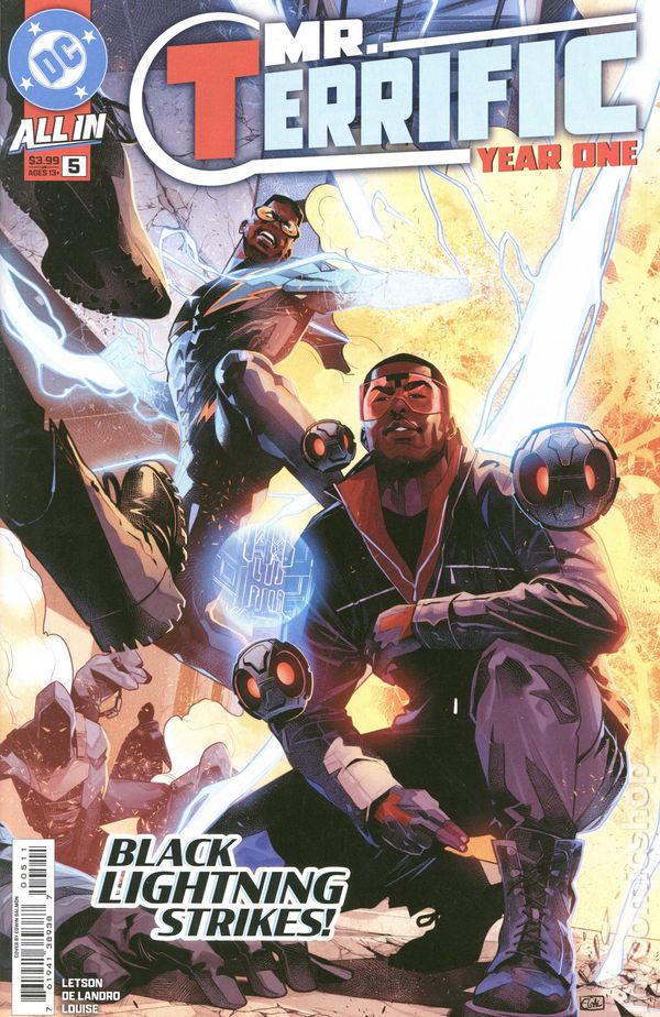 Written by Al Letson. Art by Valentine De Landro. Cover by Edwin Galmon. GUEST-STARRING BLACK LIGHTNING! Maybe super-heroics are best left to those with superpowers and science best left to the scientists. At least, that's what Michael Holt tries to tell his old friend Jefferson Pierce--Black Lightning himself--as Athena Prescott's reign of terror grows into something altogether otherworldly...and threatens to bring Gateway City to its knees. Meanwhile, in the present, Mr. Terrific desperately searches for a way home, lest he remain trapped in the Palace of Eternity with a mysterious enemy who wants him dead! 28 pages, full color. Rated T+ Cover price $3.99.