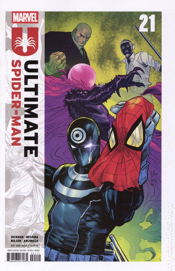 Limited 1 for 25 Retailer Incentive Variant Cover. Written by Jonathan Hickman. Art by David Messina. Cover by Alexander Lozano. THE FINAL MEETING OF THE SINISTER SIX? Blood boils over as these warring villains gather to destroy each other once and for all…or will they reunite against their common enemy, Spider-Man? 28 pgs, FC, T. Cover price $4.99.
