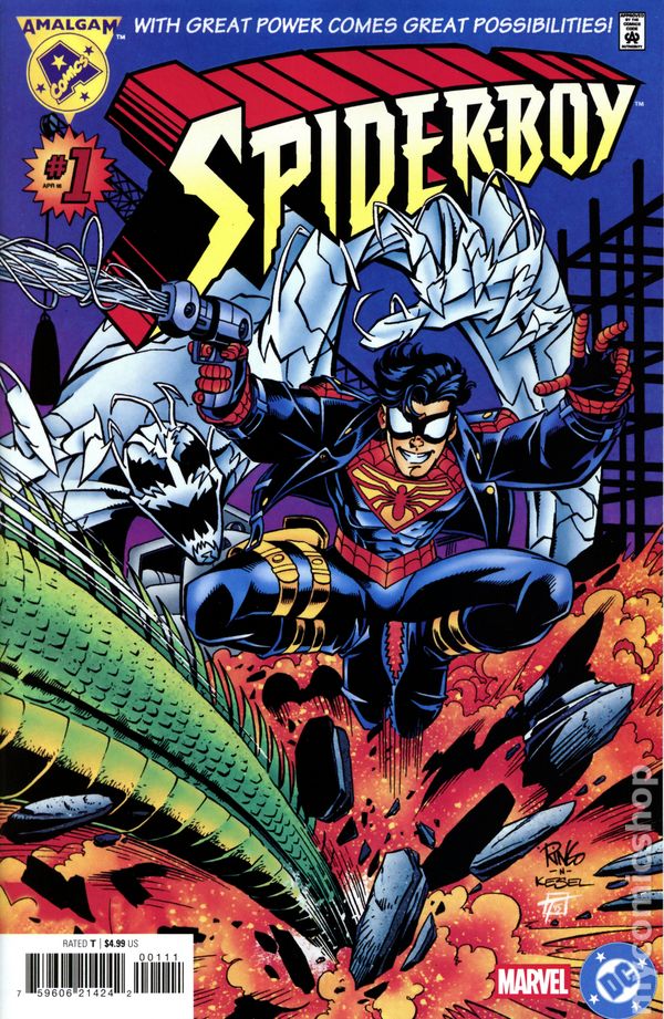 Written by Karl Kesel. Art by Mike Wieringo. Cover by Mike Wierengo. As iconic heroes of two worlds collide in the Amalgam Universe, get ready to meet Pete Ross - your friendly neighborhood clone known as Spider-Boy! Join the amazing Arach-Kid mid-fight as he protects Project Cadmus from the deranged D.N.Alien, Bizarnage! But even if he can solve that problem, big trouble lies ahead courtesy of a somehow giant-sized King Lizard! Can Spider-Boy bring his reptilian rogue down to size in time to meet the blind date lined up for him by his ally, Otto Octavius? Face it, tiger - you're dying to find out! After almost thirty years, one of the all-time great DC/Marvel crossover comic books is boldly re-presented in its original form - ads and all! Reprinting SPIDER-BOY (1996) #1. 32 pages, full color, rated T. Cover price $4.99.