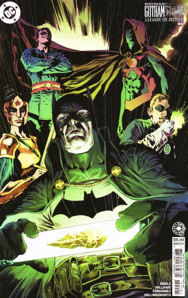 Written by Andy Diggle, Rob Williams. Art by Leandro Fernandez. Cover by Leandro Fernandez. THE LEAGUE OF JUSTICE VS. GENERAL ZOD! The League for Justice has found itself against a foe like none other: General Zod! Will this newly formed team succeed in their struggle for control over the Kryptonite Core power source and its near-infinite power, or will the dreaded general use its power to make the very Earth kneel before him? Meanwhile, Cyborg and Flash--the two newest additions to the League, who are still getting acclimated to life outside Luthors laboratory--discover a dark secret that Batman is hiding in his cave. 40 pages, full color, rated 13+. Cover price $4.99.