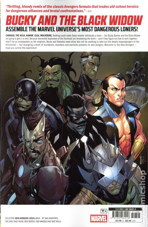 Volume 1 - 1st printing. "Killuminati!" Collects The New Avengers (2025 Marvel) #1-5. Written by Sam Humphries. Art by Ton Lima and Tiago Palma. Cover by Stephen Segovia. Bucky Barnes and the Black Widow assemble five of the most dangerous loners in the Marvel Universe! Carnage. The Hulk. Namor. Clea. Wolverine. Nothing could make these volatile individuals a team — but Bucky Barnes and the Black Widow are going to give it a shot. Because demented duplicates of the Illuminati are threatening the world — and if they figure out how to work together, theyll be as unstoppable as the originals. Bucky and Natasha need allies who will do anything to take out the duplicates — but wrangling a team of killers, monsters and warlords presents its own dangers. Welcome to the New Avengers — hope you survive the experience! Softcover, 120 pages, full color. Rated T+ Cover price $17.99.