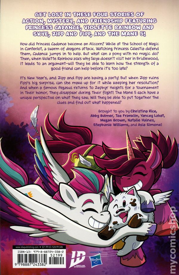 1st printing. Written by Christina Rice, Tee Franklin, Megan Brown, and Stephanie Williams. Art by Abby Bulmer, Yancey Labat, Natalie Haines, and Asia Simone. Cover by Brianna Garcia. Back Cover by Natalie Haines. How did Princess Cadance become an Alicorn? While at the School of Magic in Canterlot, a swarm of dragons attack. Watching Princess Celestia defend them, Cadance jumps in to help. But, what can a pony with no magic do? Then, when Violette Rainbow asks why Skye doesn't visit her in Bridlewood it leads to an argument, but will they be able to learn how the strength of a good friend can help before it's too late? It's New Years and Zipp and Pipp are having a party! But when Zipp ruins Pipp's big surprise, can she make up for it while keeping her resolution? And, when a famous pegasus returns to Zephyr Heights for a tournament in their honor, they disappear during their flight! The Mane 5 each have a unique perspective on what they saw. Will they be able to put together the clues and find out what happened? Softcover, 136 pages, full color. All Ages Cover price $21.99.