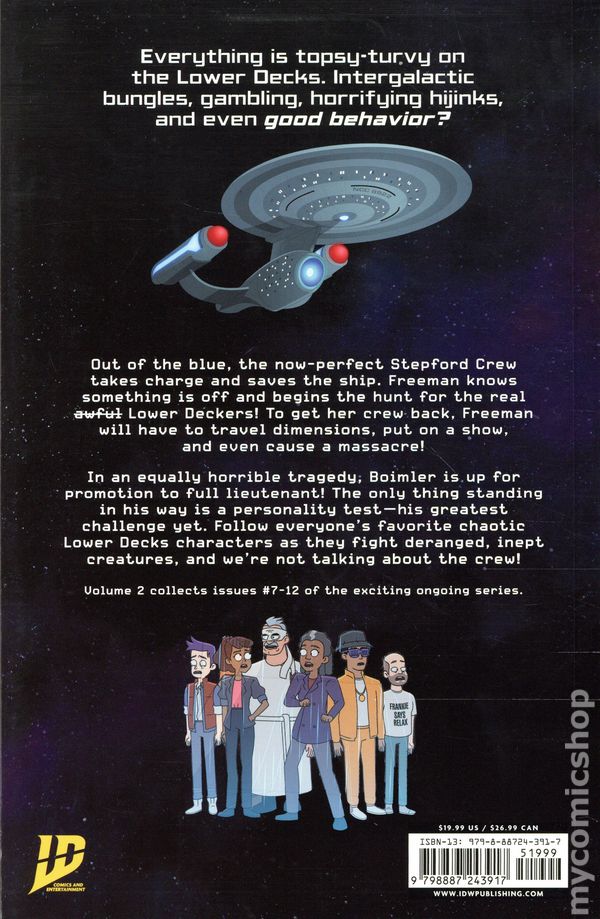Volume 2 - 1st printing. "Mixed Signals!" Collects Star Trek: Lower Decks (2024 IDW) #7-12. Written by Tim Sheridan. Art by Robby Cook, Vernon Smith, Jack Lawrence, Philip Murphy, and Maria Keane. Cover by Robby Cook. Back Cover by Robby Cook and Philip Murphy. In this hilarious comic book series, the Lower Deckers of the U.S.S. Cerritos face intergalactic hijinks, infighting, and even morality! Everything is topsy-turvy on the Lower Decks. Intergalactic bungles, gambling, horrifying hijinks, and even good behavior? Out of the blue, the now-perfect Stepford Crew takes charge and saves the ship. Freeman knows something is off and begins the hunt for the real (awful) Lower Deckers! To get her crew back, Freeman will have to travel dimensions, put on a show, and even cause a massacre! In an equally horrible tragedy, Boimler is up for promotion to full lieutenant! The only thing standing in his way is a personality test—his greatest challenge yet. Follow everyone's favorite chaotic Lower Decks crew as they fight deranged, inept creatures, and were not talking about them! Softcover, 144 pages, full color. Rated T Cover price $19.99.