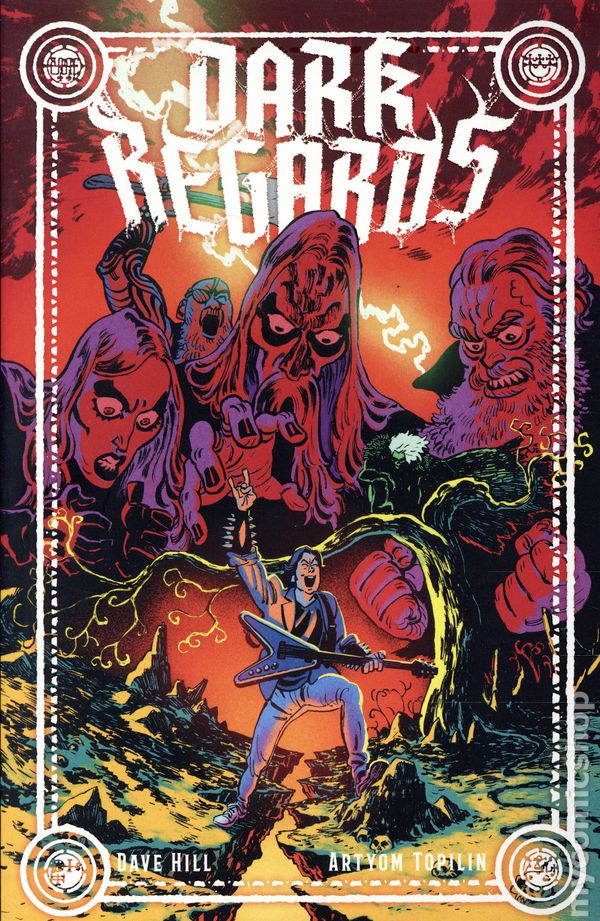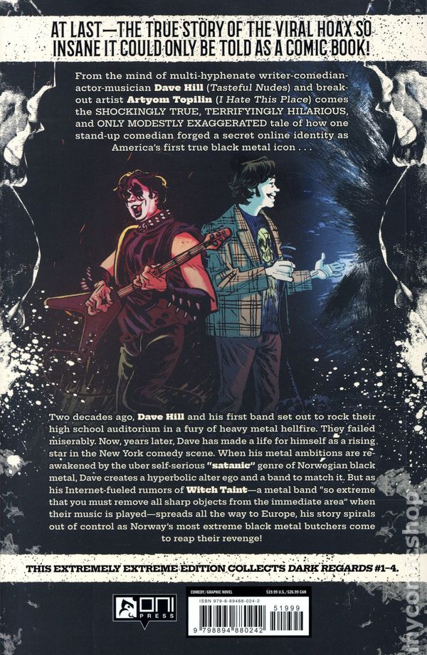 1st printing. Collects Dark Regards (2025 Oni Press) #1-4. Written by Dave Hill. Art and Cover by Artyom Topilin. AT LAST—THE TRUE STORY OF THE VIRAL HOAX SO INSANE IT COULD ONLY BE TOLD AS A COMIC BOOK!From the mind of multi-hyphenate writer-comedian-actor-musician Dave Hill (Tasteful Nudes) and breakout artist Artyom Topilin (I Hate This Place) comes the SHOCKINGLY TRUE, TERRIFYINGLY HILARIOUS, AND ONLY MODESTLY EXAGGERATED tale of how one stand-up comedian forged a secret online identity as Americas first true black metal icon . . . Two decades ago, Dave Hill and his first band set out to rock their high school auditorium in a fury of heavy metal hellfire. They failed miserably. Years later, Dave has made a new life for himself as a rising star in the New York comedy scene—a career where getting laughed at on stage is the entire point and not just a tragic consequence. But when Daves metal ambitions are reawakened by the über self-serious satanic genre of Norwegian black metal, Dave creates a ridiculously hyperbolic alter ego and a band to match that, together, reignite the spark of his forgotten rock n roll fantasy. But when Daves internet-fueled rumors of Witch Taint—a metal band so extreme that you must remove all sharp objects from the immediate area when their music is played—spreads all the way to Europe, his story will spiral dangerously out of control as Norways most extreme black metal butchers come to reap their revenge . . . and put everything and everyone Dave holds dear in the crosshairs (of their axes, which, truth be told, dont actually have crosshairs, but hey, its a metaphor). Softcover, 112 pages, full color. Mature Readers Cover price $19.99.