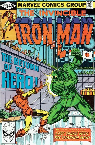 Newsstand Edition. "Return of the Hero" Part 2 of 2. Plot by David Michelinie and Bob Layton. Script by David Michelinie. Art by Jerry Bingham (breakdowns) and Bob Layton (finishes). Cover by Bob Layton. In the heart of Times Square, the golden avenger comes face-to-face with the Titanium Man! The green-armored communist has come to the Big Apple to destroy the center of American capitalism! And along the way get back in the good graces of his Soviet superiors! But Shell-Head isn't about to let his old adversary wreck the city! The Invincible Iron Man and the Titanium Man rumble across Midtown Manhattan until they reach the famous Rockefeller Center ice rink! Can Shell-Head score another cold war victory for the U.S.A.? A fabulous fight! Cameo appearance by Bethany Cabe. Flashback cameos by the Crimson Dynamo, Radioactive Man, and Unicorn. 32 pages. Cover price $0.40.