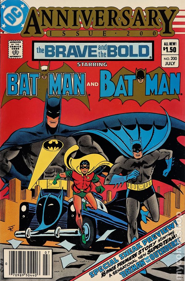 Direct Edition. 64-page giant. Cover by Jim Aparo. Final issue of the series-1st Appearance of Katana, 1st appearance of Geo-Force, and 1st appearance of Halo. The Golden Age Batman stars in "Smell of Brimstone, Stench of Death!", script by Mike Barr, pencils by Dave Gibbons, inks by Dave Gibbons (1-3, 20-40) and Gary Martin (4-19); The story explains how 2 different personas for Brimstone exist: Both aware somehow of each others' existences on a spiritual level; In 1955, on Earth-2, Brimstone's defeated by Batman and sent to prison, but later transfers his 'spiritual' essence to his doppelganger on Earth-1 in 1983 to restart his criminal empire; He learns of a Batman on this world, but is also defeated here by him; When his essence returns to its own body, it is a vegetable by this time, trapping him there for the rest of his natural life, while his 'good' Earth-1 counterpart is unaware of what happened. The contemporary Batman stars in "Hell on Earth!", script by Barr, art by Gibbons. Back-up story: 1st appearance of Batman and the Outsiders in a 16-page sneak preview, script by Barr, art by Jim Aparo. One-page Bat-Mite strip by Stephen DeStefano. 68 Pages, Full Color. Cover price $1.50.