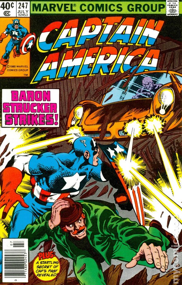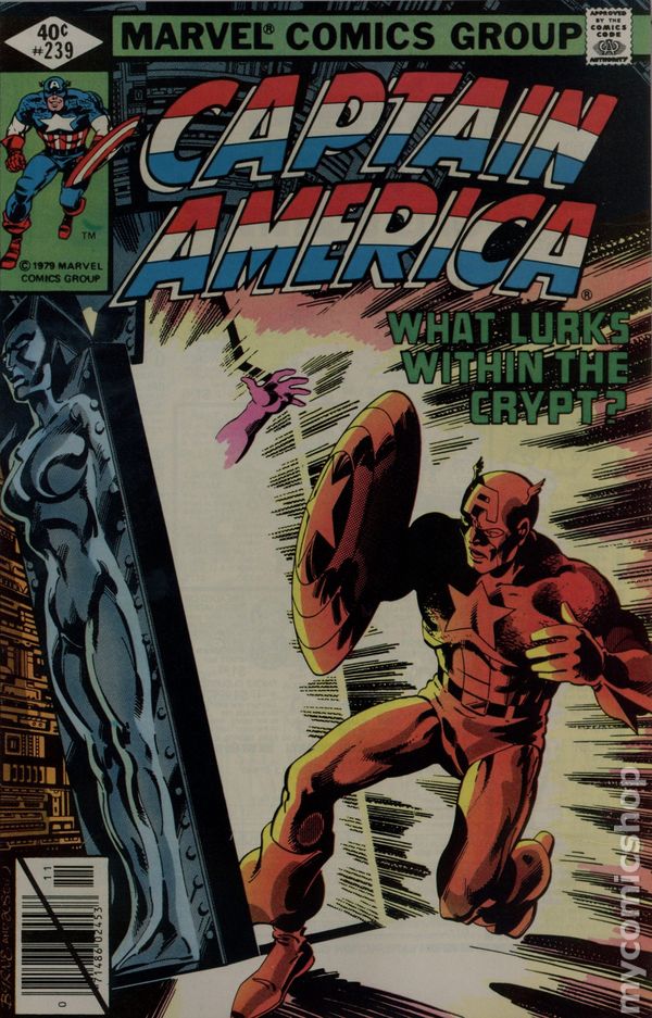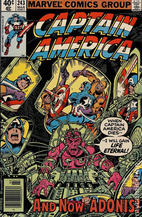 Direct Edition. "The Lazarus Conspiracy!" Part 1 of 2. Script by Roger McKenzie. Art by Rich Buckler (breakdowns) and Don Perlin (finishes). Cover by George Pérez and Joe Sinnott. At the Federal Courthouse in Lower Manhattan, Captain America interrupts a group of costumed thieves stealing the SHIELD master matrix -- which is used for creating Life Model Decoys. After the villains load the master matrix on a helicopter, Cap follows in hot pursuit! The trail leads to the Cameron Electronics Plant and a twisted dying old man inside -- looking to become the next Adonis. (Note: This issue includes a sideways full-page ad featuring Batroc the Leaper promoting Crazy Magazine.) 36 pages. Cover price $0.40.