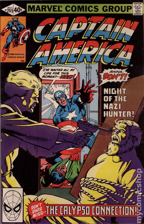 Newsstand Edition. "The Calypso Connection!" Script by Roger McKenzie. Art by Carmine Infantino (breakdowns) and Joe Rubinstein (finishes). Cover by Frank Miller and Joe Rubinstein. Steve Rogers' new neighbor, Anna Kapplebaum, is a Holocaust survivor. And one day while walking to the butcher shop, she bumps into a man she knew from the war -- a cruel man she would like to forget. One thing leads to another...and Captain America finds himself on the hunt for a nazi war criminal in Long Island! Can the Living Legend close a painful chapter in the life of his dear friend? Cameo appearance by Jake Lockley. (Notes: This issue completes Roger McKenzie's 2-year run as the writer of the Captain America series. He authored 15 stories during his stint.) 36 pages. Cover price $0.40.