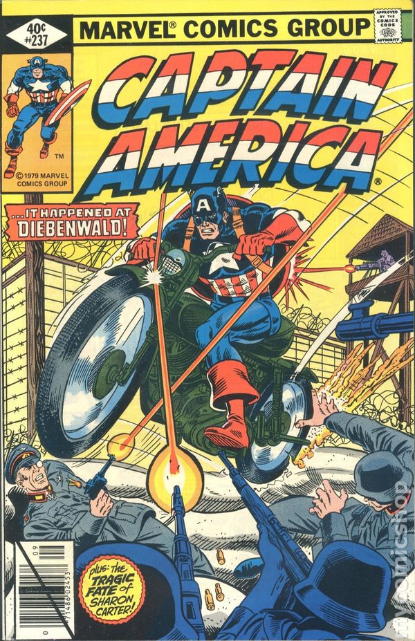 Newsstand Edition. "By the Dawn's Early Light!" Part 1 of 3. Plot by Roger Stern and John Byrne. Script by Roger Stern. Pencils by John Byrne. Inks by Joe Rubinstein. Cover by John Byrne and Joe Rubinstein. The Living Legend travels to SHIELD Headquarters in Manhattan to find answers about his past...after feeling uneasy about the details he learned previously (in Captain America 225). Dum Dum Dugan greets Cap and takes him to Fort Dix in New Jersey...where SHIELD is storing Steve Rogers' old foot locker. Meanwhile at a federal prison in Upstate New York, Nick Fury visits Baronvon Strucker. The SHIELD Director wants to question von Strucker about his most recent caper, but the crafty von Strucker gets the drop on Fury instead! The former head of Hydra steals Fury's aerocar and flies to Fort Dix to ambush Captain America! It seems quite appropriate -- that as Caplearns about his past -- he battles a major foe from his past! First (cameo) appearance of Bernie Rosenthal. Cameo appearance by Machine smith. (Note: This issue begins the acclaimed Stern-Byrne run on the Captain America title.) 36 pages. Cover price $0.40.