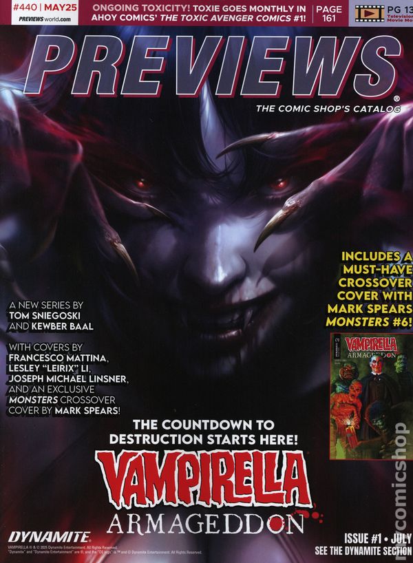 ON OUR FRONT COVER: Tom Sniegoski's Vampirella saga set in the future world of Sepulcher City continues with artist Kewber Baal in Dynamite Entertainment's Vampirella: Armageddon. ON OUR FLIPSIDE COVER: Diamond Select Toys' acclaimed series of statues inspired by Skottie Young's variant covers for Marvel Comics continues with the Marvel: Deadpool (Finger Guns) Animated-Style Resin Statue. This Month's Theme: Television & Movie Month. Indie Edge: Garresh. PREVIEWS is your ultimate guide to comics, graphic novels and pop-culture merchandise available from your local comic book shop...revealed up to two months in advance! Read detailed product descriptions and storylines for hundreds of comic books and graphic novels from the top comic book publishers and see the coolest toys and pop-culture merchandise on Earth! Plus: PREVIEWS Exclusive items you'll find nowhere else! It's a great monthly read to find out what's at comic shops! Each issue includes a download code for a FREE digital edition of this month's PREVIEWS! This May issue features items scheduled to ship in July 2025 and beyond. 434 pages, full color. Cover price $4.99.