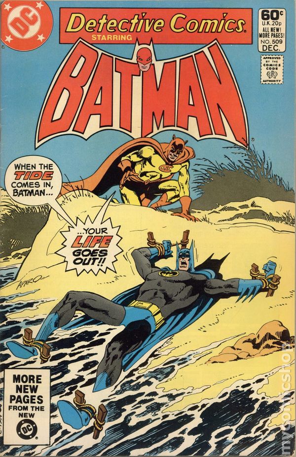 Cover pencils by Gene Colan, inks by Dick Giordano. "Requiem for Skulls," script by Doug Moench, pencils by Gene Colan, inks by Klaus Janson; Batman has a return engagement with the Savage Skull, while Harvey Bullock makes trouble for Commissioner Gordon. "Getting Up II: Poisoned Art," script by Joey Cavalieri, pencils by Paris Cullins, inks by Pablo Marcos; Green Arrow saves himself by aiming the spray can at the ground and propelling himself back through the window; The man who exchanged canisters with Ozone tries to take his can back at gunpoint, but Green Arrow captures the man and Ozone escapes. 36 pgs., full color. $0.60. Cover price $0.60.