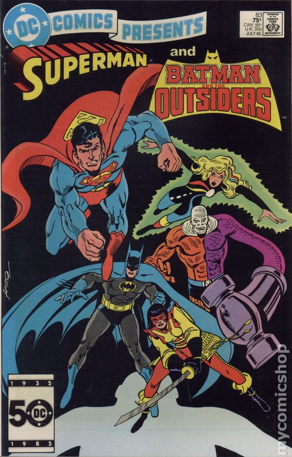 Direct Edition. It's up to Superman, Batman and the Outsiders (Black Lightning, Halo, Geo-Force, Katana and Metamorpho) to take on the Outsider and Ira Quimby (I.Q.) in "Shadow of the Outsider!" Written by Mike W. Barr. Art by Irv Novick & Dave Hunt. Cover by Jim Aparo. Cover price $0.75.