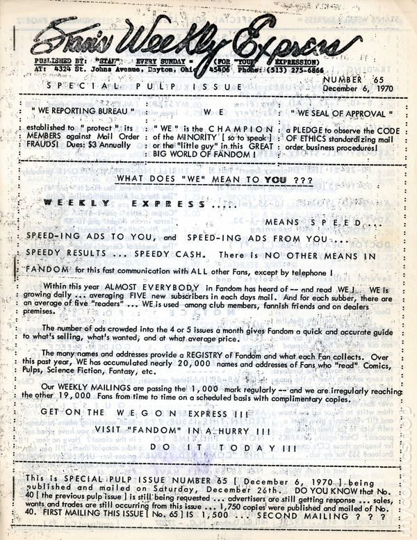 Stan's Weekly Express (or WE, for short) was a weekly adzine published from 1969 to 1973 by Stanley Blair of Houston, Texas. It was a direct forerunner of the Comics Buyer's Guide. Blair founded the WSA (short for Stan's Weekly Express Seal of Approval) to serve as a guard against mail fraud for the blossoming comic fandom industry. (Thanks to http://www.comicbookfanthropology.com and http://en.wikipedia.org/wiki/Comics_Buyer's_Guide for the above information!)