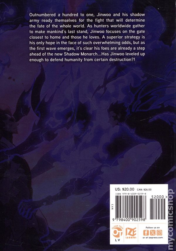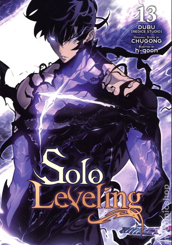 Volume 13 - 1st printing. Written by Chugong. Art and cover by DUBU. Adapted by h-goon. Translated by Hye Young Im. Outnumbered a hundred to one, Jinwoo and his shadow army ready themselves for the fight that will determine the fate of the whole world. As hunters worldwide gather to make mankinds last stand, Jinwoo focuses on the gate closest to home and those he loves. A superior strategy is his only hope in the face of such overwhelming odds, but as the first wave emerges, its clear his foes are already a step ahead of the new Shadow Monarch...Has Jinwoo leveled up enough to defend humanity from certain destruction?! Softcover, 6-in. x 8-in., 296 pages, full color. Older Teen Cover price $20.00.