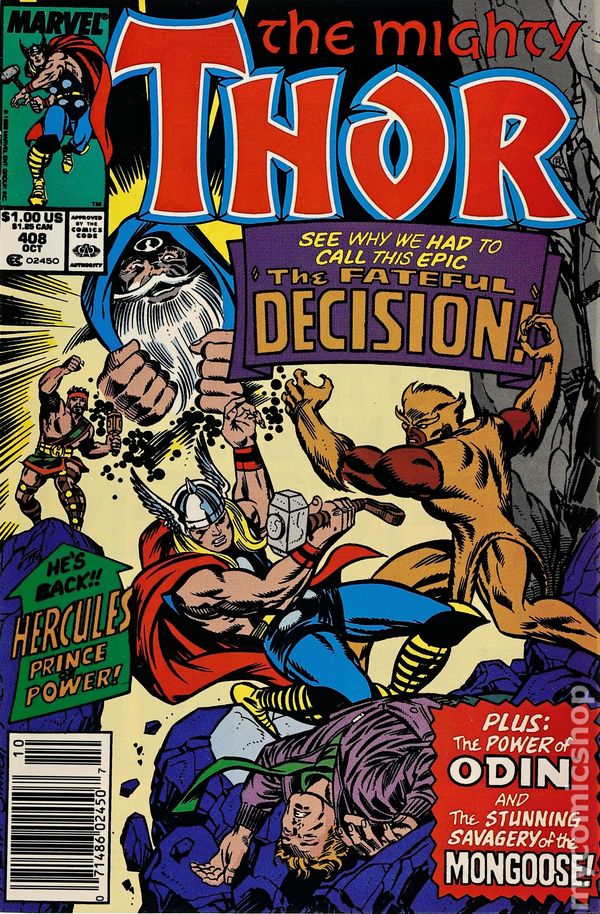 Newsstand Edition. Cover pencils by Ron Frenz, inks by Joe Sinnott. First appearance of Thunderstrike (cameo) in "The Fateful Decision!", script by Tom DeFalco (plot and script) and Ron Frenz (plot), pencils by Ron Frenz, inks by Joe Sinnott (finishes); Hercules, High Evolutionary, Eric Masterson, and Thor have returned to Wundagore; High Evolutionary tells them they should leave because they are returning to study the Black Galaxy; Mongoose attacks and during the battle, Eric lifts Mjolnir, but receives a fatal blast before he can strike; Hercules manages to drive Mongoose off and Thor pleads to Odin to spare Eric; Eric becomes Thor. "There Dwells a Monster!", script by Tom DeFalco, pencils by Mike Mignola, inks by Bob Wiacek; Thor goes to the Land of the Trolls, to stop their raids on the countryside at the source; The Rock Trolls capture Thor and present them to their leader, Grundor the Greater. 36 pgs., full color. $1.00. Cover price $1.00.