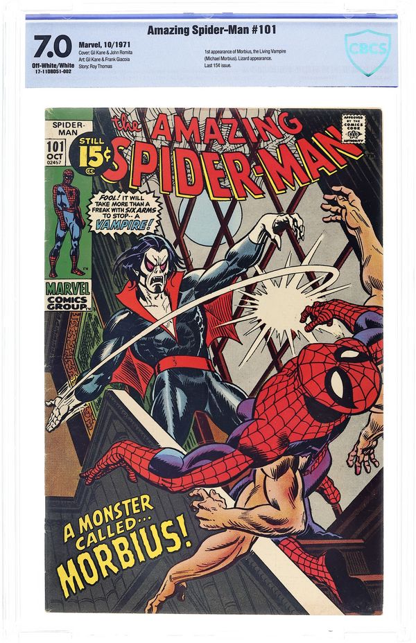 First appearance of Morbius the Living Vampire in "A Monster Called Morbius!" Script by Roy Thomas. Pencils by Gil Kane. Inks by Frank Giacoia. Cover by Gil Kane and John Romita. The first 100 issues of the Amazing Spider-Man title are in the books! And the next chapter in the web-slinger's anthology kicks off with the debut of Marvel's first bronze age vampire: Morbius! However, at the moment Peter Parker has a much bigger problem on his (six) hands. After drinking the special potion he developed, Aunt May's nephew grew four additional arms! Oh, my goodness! Peter is desperate to find a way to remove the arms, so he calls Dr. Curt Connors for help. Dr. Connors has a summer house and laboratory in Southampton on Long Island...and he gives Spider-Man permission to stay there and work on a cure. Meanwhile, a strange, pale, and bloodthirsty man is the sole survivor of a shipwreck near Southampton. And he's looking for a quiet place to rest. Oh no. Is the six-armed Spider-Man on a collision course with a living vampire? Oh yes! Cameo appearances by Gwen Stacy, J. Jonah Jameson, Joe Robertson, and the Lizard. Last 15¢ cover price. (Notes: This is the first issue of the Amazing Spider-Man series not written by Stan Lee. There exists a second printing of this issue published in 1992 with a silver background cover. Marvel also published a facsimile edition of Amazing Spider-Man 101 in 2021.) 36 pages. Cover price $0.15.