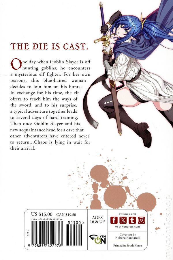 Volume 4 - 1st printing. Written by Kumo Kagyu. Art and cover by Shingo Adachi. Character Design by Noboru Kannatuki. Translated by Kevin Steinbach. While Goblin Slayer is off hunting goblins, he encounters a mysterious elf fighter. For her own reasons, this blue-haired woman decides to join him on his hunts, and they work together. The payment? Training in the sword from this elf fighter. A standard adventure ends, giving way to days of hard training. When Goblin Slayer and his new acquaintance head for a cave that other adventurers have entered never to return, Chaos is waiting for them... Softcover, 5-in. x 7-in., 216 pages, Text (with B&W Chapter Illustrations). Ages 16&Up Cover price $15.00.