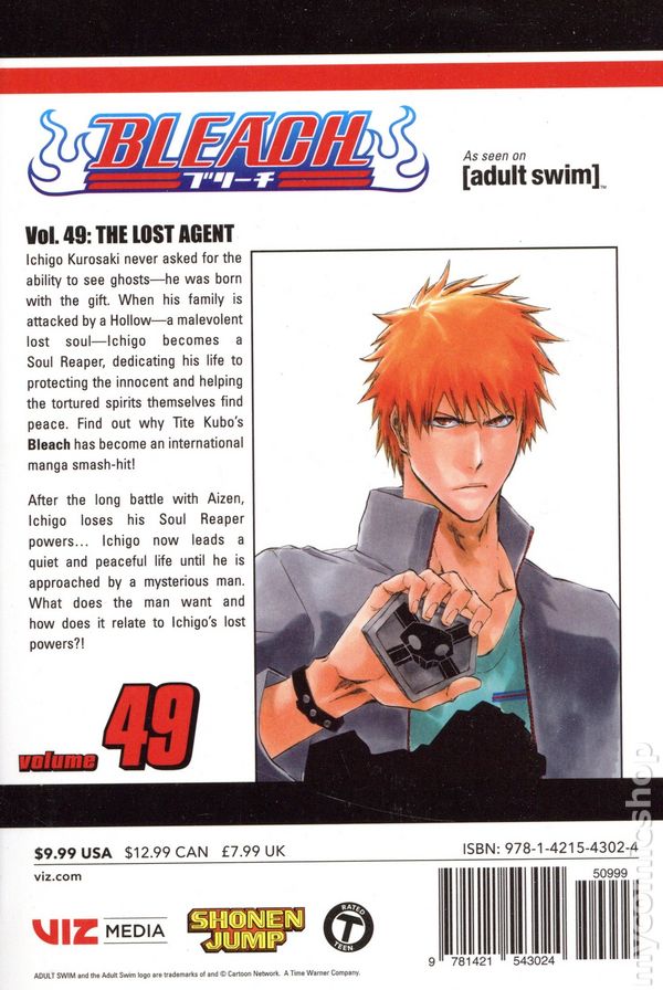 Volume 49 - 1st printing. Story and art by Tite Kubo. After a long battle, Ichigo loses his Soul Reaper powers... Ichigo now leads a quiet and peaceful life until he is approached by a mysterious man. What does the man want and how does it relate to Ichigo's lost powers?! Softcover, 5-in. x 7-in., 192 pages, B&W. NOTE: These are Japanese manga-style GNs and are meant to be read right-to-left. Cover price $9.99.