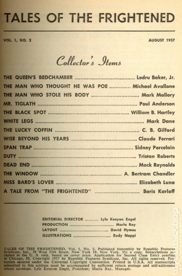 Final issue of the series. "The Perfect Hide-Out," "The Rag Doll," "Twenty Long Years" (art by Al Endeh), "Untouched By Human Hands" (art by Robert Q. Sale), "Isolation" (art by "Solly"--Sol Brodsky?), "The Five Sinister Statues" (art by Richard Doxsee), and a two-page text story, "Robot's Holiday." Bill Everett cover. Cover price $0.10.