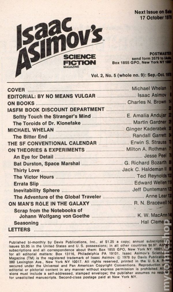 View scanVolume 2, Issue 5 - September/October 1978. Editorial by Isaac Asimov. Stories by E. Amalia Andujar, Milton A. Rothman, Jack C. Halderman II, Randell Garrett, and Hal Clement. Cover by Michael Whelan. Science Fiction stories, articles, and editorials. 194 pages, Text (with sporadic B&W illustrations) Cover price $1.25.