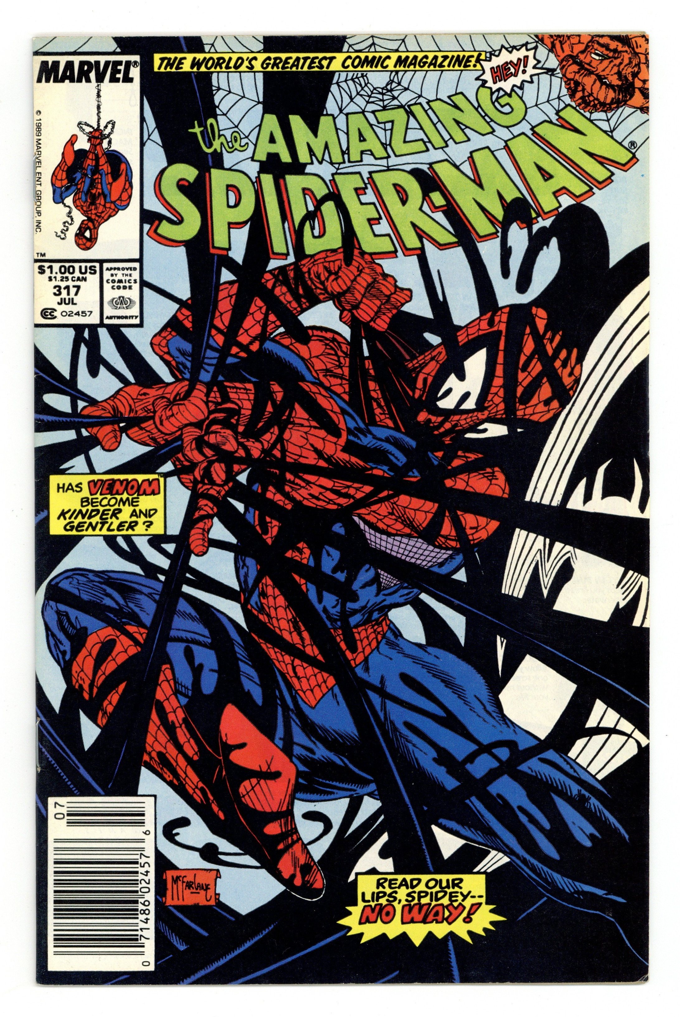 Tags: Spider-Man$29.00Newsstand Edition. "The Sand and the Fury!" Part 2 of 2. Script by David Michelinie. Art by Todd McFarlane. Cover by Todd McFarlane. After fleeing from Venom last issue, the web-slinger returns to the sanctuary of Aunt May's home in Queens! Peter and Mary Jane have only been living there for a few days and haven't had any visitors. But suddenly their first one knocks on the door: Venom! What?! Is the crazed villain going to slay Aunt May and her elderly boarders? No, the savage psychopath just stopped by to issue a challenge to her wall-crawling nephew! Meet in the morning at Montauk Point off Long Island Sound for a duel to the death! Wow, does the web-slinger have a chance vs. the overpowering Venom? The situation does not look good for your friendly neighborhood Spider-Man. Cameo appearance by the Thing (aka Ben Grimm). (Notes: Venom appears next in the Avengers' graphic novel: Death Trap The Vault. Venom returns to torment the web-slinger again in Amazing Spider-Man 332 & 333.) 36 pages. Cover price $1.00.