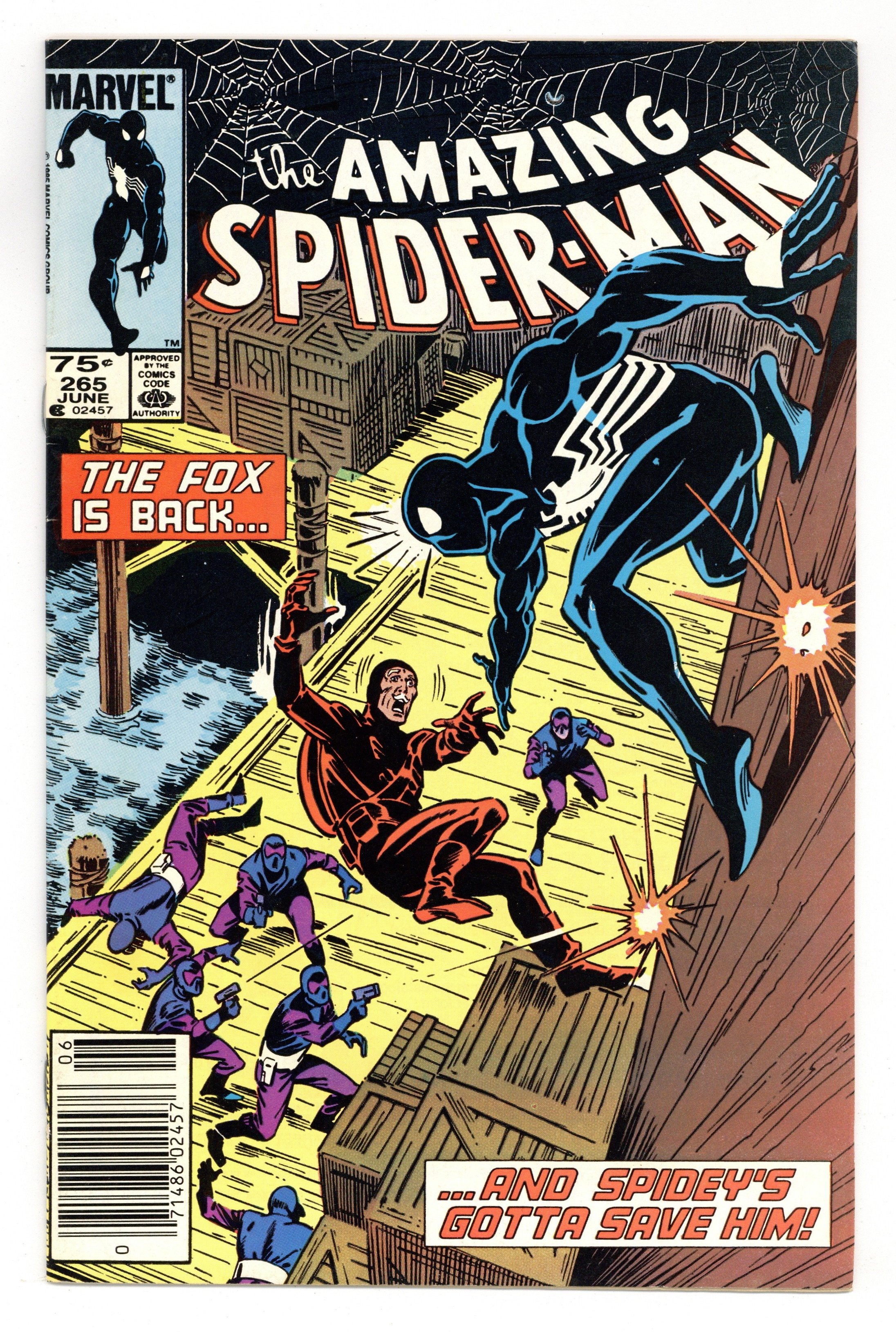 Tags: Marvel Legacy Numbering: Amazing Spider-Man (part 265), Spider-Man$29.00First printing. Direct Edition. First appearance of Silver Sable. Script by Tom DeFalco. Pencils by Ron Frenz. Inks by Joe Rubinstein. Cover by Ron Frenz and Joe Rubinstein. "After the Fox!". The Black Fox is on the run! But it's not the Spectacular Spider-Man who's chasing him! It's Silver Sable! An adventurer for hire from the European country of Symkaria! Silver Sable and her Wild Pack pursue the fox through the streets of Manhattan and then later corner him on the waterfront! However, the aging international jewel thief has a wall-crawling guardian angel! Down on the docks, the sparks fly as the web-slinger gives Silver Sable a lesson in diplomacy...superhero-style! Second appearance of the Black Fox. Cameo appearances by Aunt May, Mary Jane Watson, Harry Osborn, Liz Osborn, and Normie Osborn. (Notes: Silver Sable appears next in Amazing Spider-Man 279. The Black Fox returns in Web of Spider-Man 14. There is a second printing of this issue published in 1992. The second printing features a gray cover and a yellow dog ear touting the first appearance of Silver Sable. This story was also reprinted in Marvel Tales 277.) 36 pgs. Cover price $0.65.