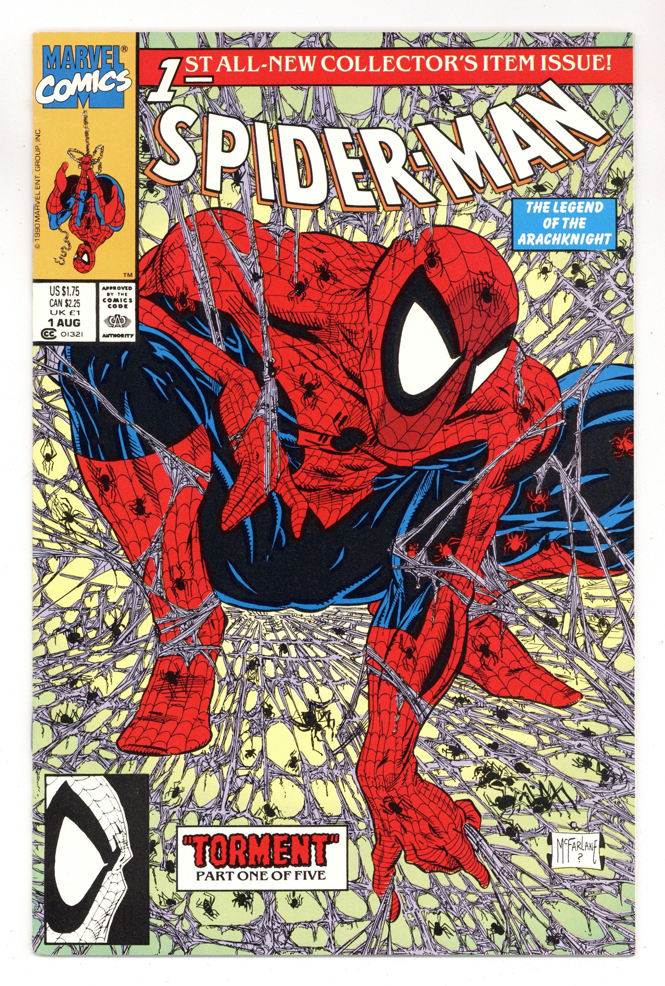 Tags: Spider-Man$26.00Unbagged Direct Edition - Torment Part 1 of 5. "Torment" Script and art by Todd McFarlane. Cover by Todd McFarlane. Fresh off his legendary run on the Amazing Spider-Man series, superstar artist Todd McFarlane takes the reins of his own Spider-title! Right off the bat the breathtaking action begins as mysterious and ominous drums awaken the Lethal Lizard! And send the reptilian creature on a path of death and destruction thru New York City! Spider-Man's nightmare is just starting! Appearance by Mary Jane Watson. (Notes: Spider-Man #1 was one of the first Marvel issues to feature numerous variant covers. The Spider-Man (1990) series became the fourth monthly title for the web-slinger. This issue was published the same month as Amazing Spider-Man 337. The letters page features an essay by Todd McFarlane. The webbing on the cover may be gray or purple.) 32 pages. Cover price $1.75.