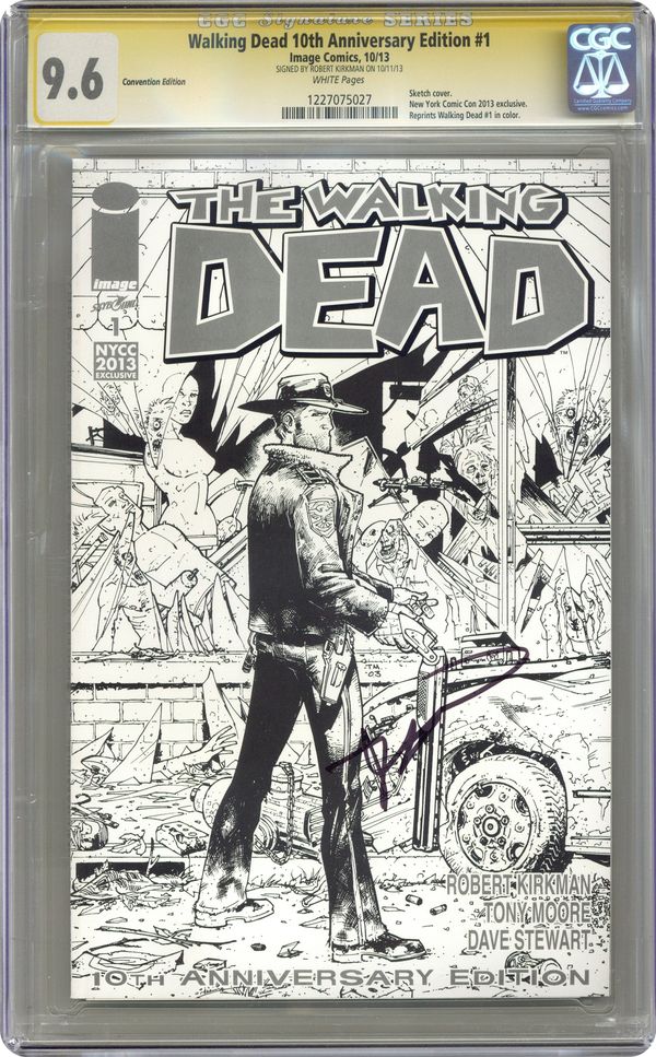New York Comic Con Black and White Exclusive Cover. (W) Robert Kirkman (A) Tony Moore, Dave Stewart (CA) Dave Stewart, Tony Moore The historic first issue of THE WALKING DEAD presented for the first time in FULL COLOR by colorist extraordinaire DAVE STEWART! Along with the original covers and variants done for this issue throughout the years and tons of other bonus material.