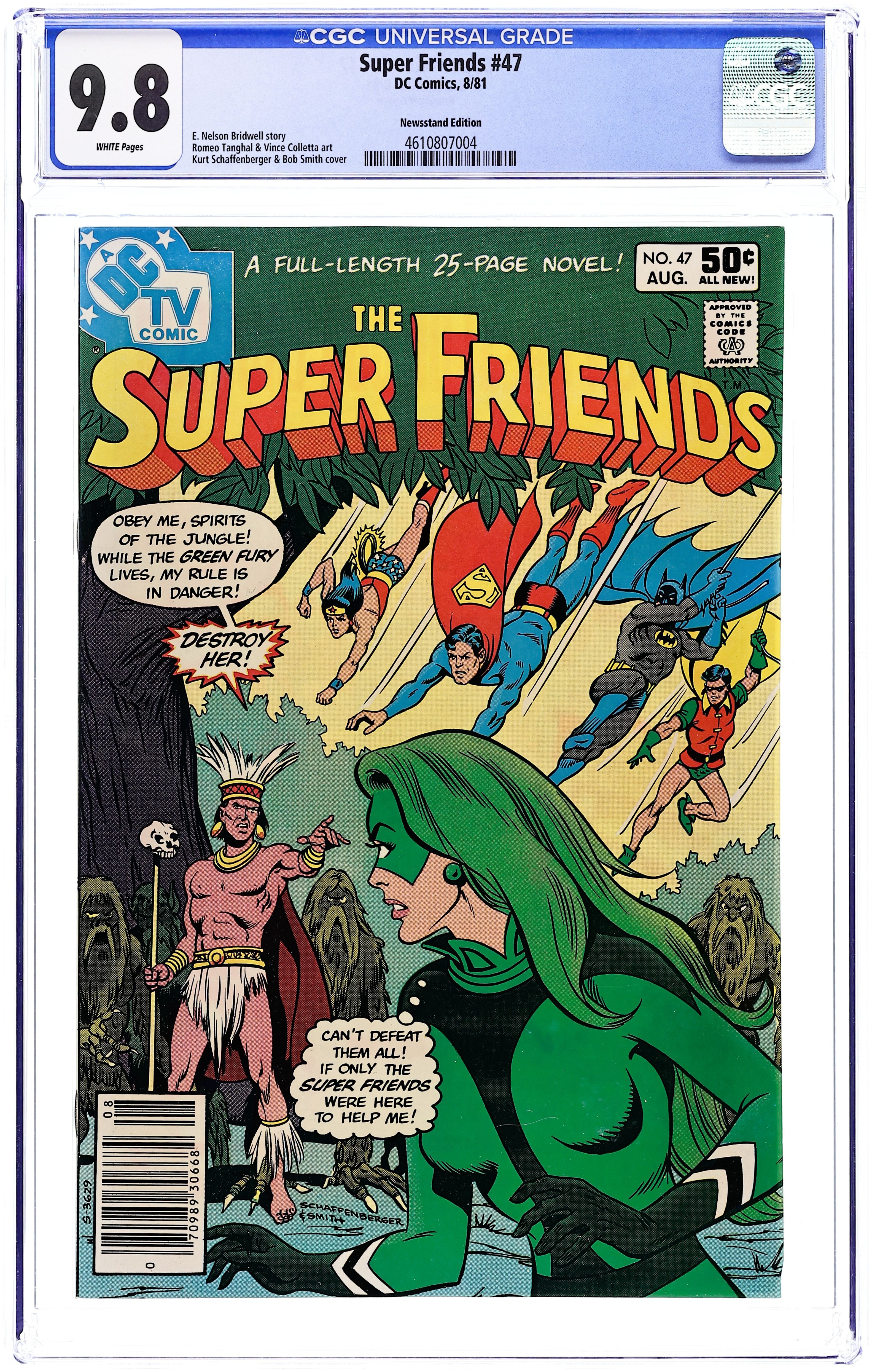 Newsstand Edition. "The Demons from the Green Hell." Summoned by the Green Fury, the Super Friends head for Brazil to stop a shaman's grandson from abusing his mystic power. Starring Aquaman, Batman, Robin, Superman, Wonder Woman, Zan, Jayna, and Gleek. Script by E. Nelson Bridwell, pencils by Ramona Fradon, inks by Bob Smith. Cover by Fradon and Smith. Cover price $0.50.