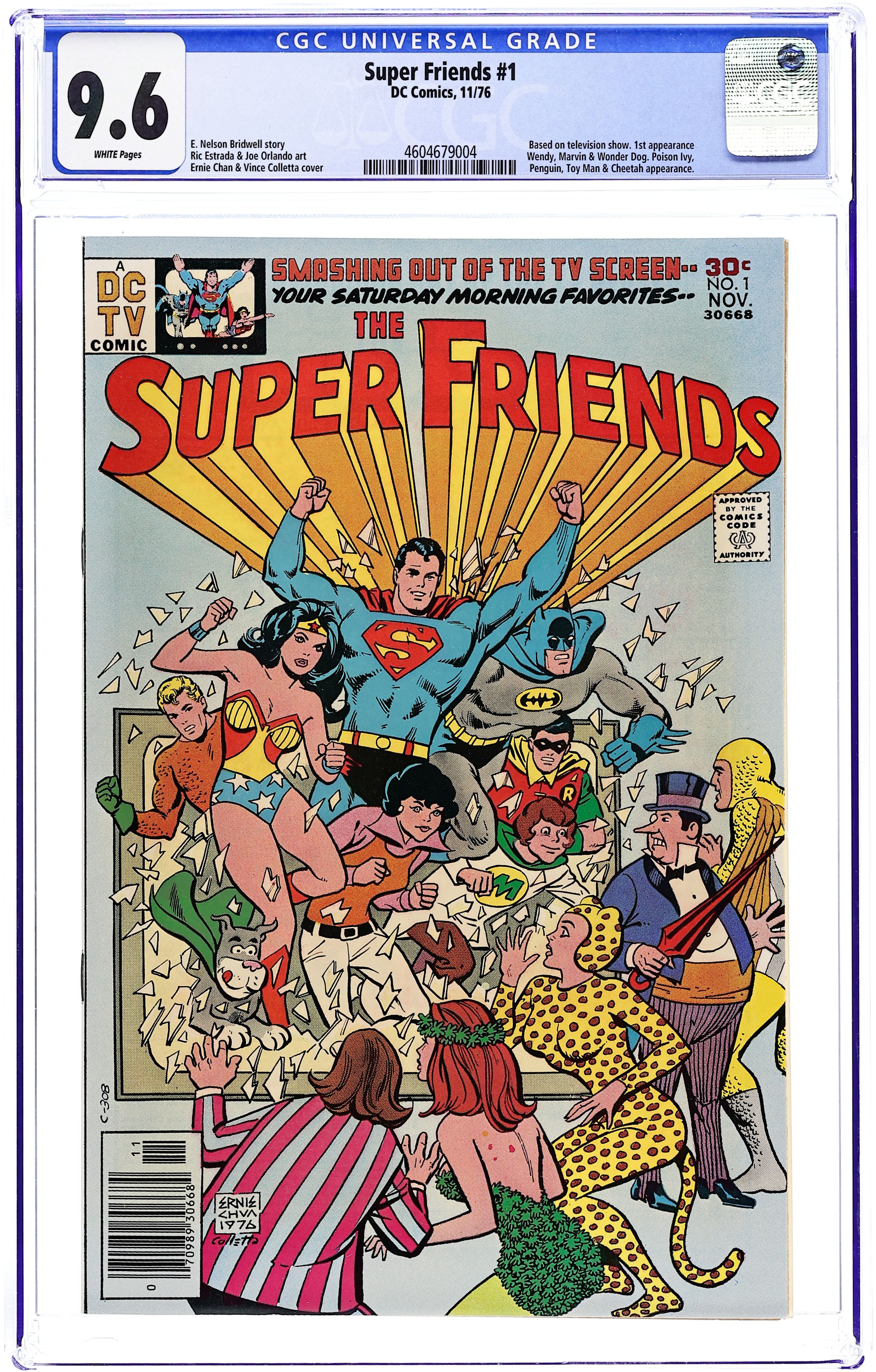 "The Fury of the Super Foes." Aquaman, Batman, Robin, Superman and Wonder Woman attempt to prevent Penguin, Poison Ivy, Cheetah, and others from stealing the components of a super robot. The Super Friends, which are essentially a watered down version of the Justice League, appeared in the Saturday morning animated series of the same name. Script by E. Nelson Bridwell, pencils by Ric Estrada and Joe Orlando, inks by Vince Colletta. Cover by Ernie Chua. Cover price $0.30.