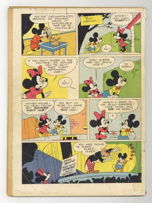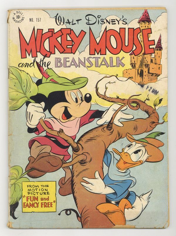 Indicia title is "Walt Disney's MICKEY MOUSE AND THE BEANSTALK, No. 157." Cover art by Don Gunn. Mickey and the Beanstalk, art by Harvey Eisenberg; Famine strikes Happy Valley when the Golden Harp is stolen; After Mickey trades his cow for some magic beans, a giant beanstalk grows into the sky, taking Mickey, Goofy, and Donald's house with it; In the land in the sky, the three go to the giant's castle and rescue the Golden Harp; Adapted from Mickey and the Beanstalk in the animated feature Fun and Fancy Free (1947). Pluto Keeps It Quiet, art by Harvey Eisenberg; Mickey gets a job as a night watchman and Pluto tries to keep the house completely quiet when Mickey sleeps during the day. 52 pages, full color. Cover price $0.10.