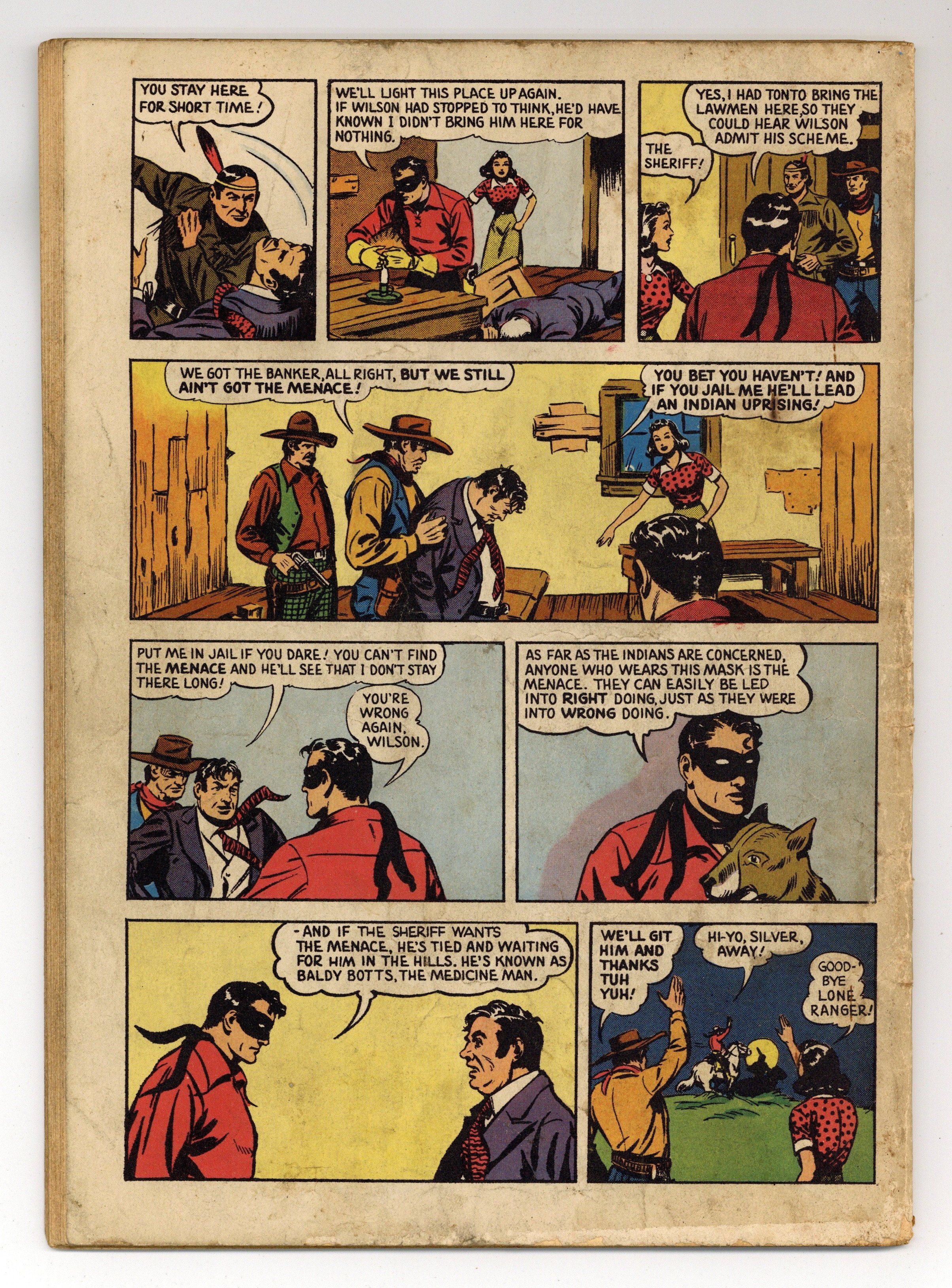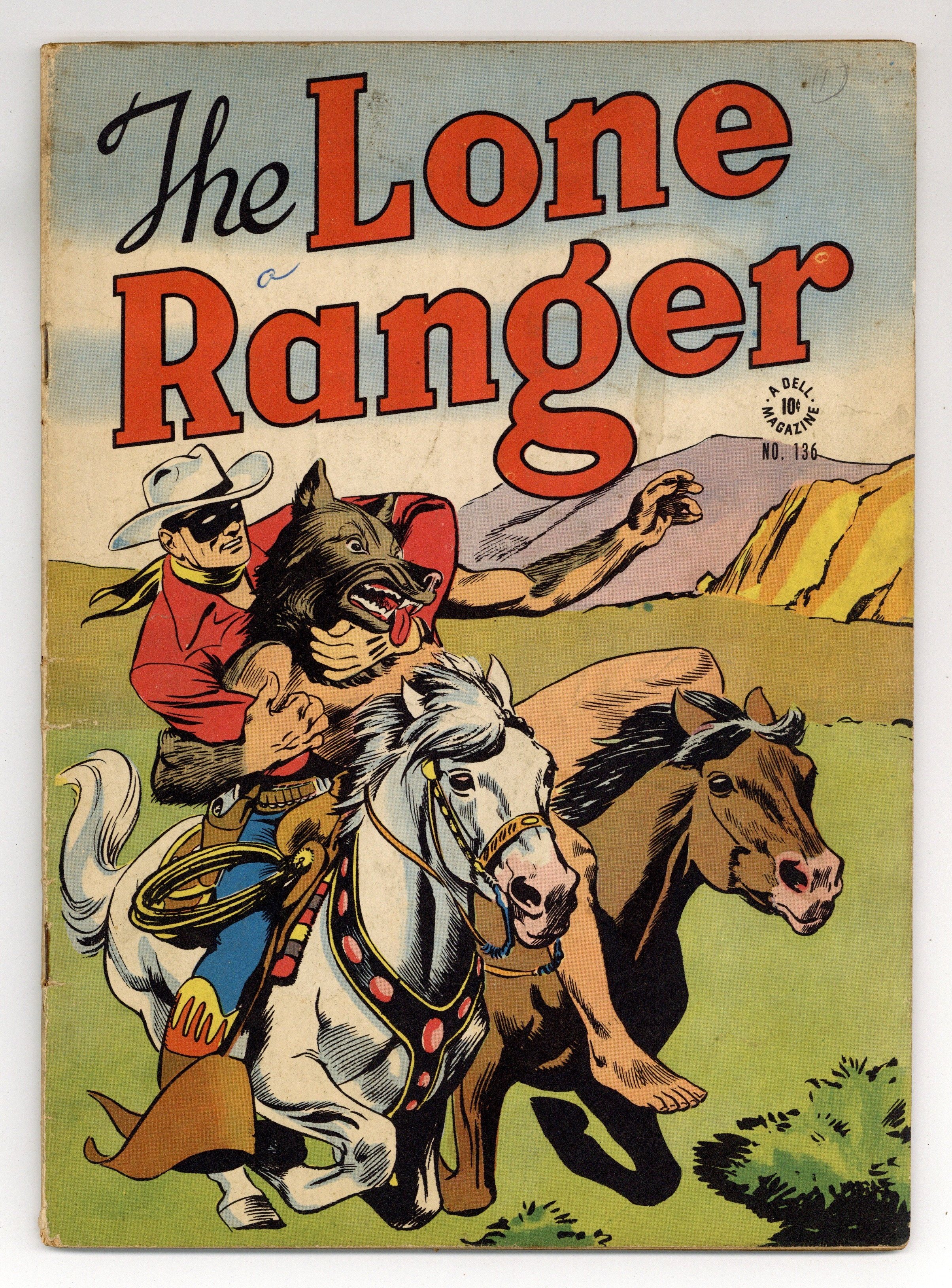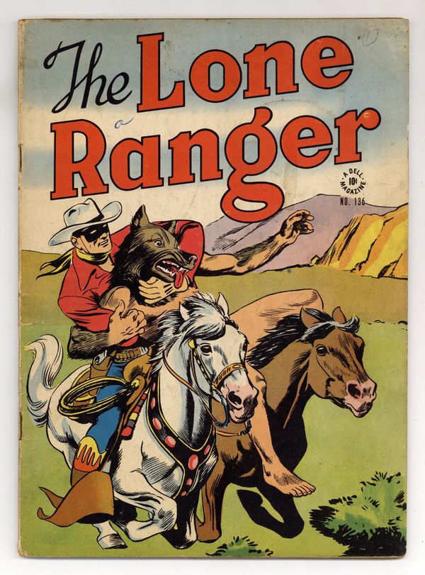 Indicia title is "THE LONE RANGER, No. 136." Cover art by Morris Gollub. Hidden Gold; The Lone Ranger and Tonto come upon a house that contains a mysterious couple who are holding a girl against her will; After escaping from a water-filled pit, the Lone Ranger helps the girl's father rescue Tonto and the girl from a gang that is after a chest of gold. Manhunt; The Lone Ranger finds Holt and persuades him to return to the cabin. The Menace; While at Stark's cabin, Tonto heard the "cry of The Menace," who was said to be half-man and half-wolf, and went after him. 52 pages, full color. Cover price $0.10.