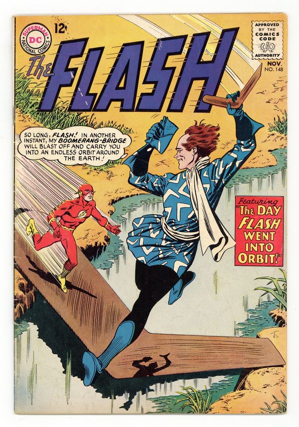 Cover pencils by Carmine Infantino, inks by Murphy Anderson. The Day Flash Went Into Orbit, script by John Broome, pencils by Carmine Infantino, inks by Murphy Anderson; Capt Boomerang tries to send Flash off into space on a giant boomerang...again. The Doorway to the Unknown, script by John Broome, pencils by Carmine Infantino, inks by Joe Giella; an offbeat story involving a call from beyond death, a classic tale of redemption and "the invincible spirit of man." Rocky and Bullwinkle star in a one-page Cheerios ad. 80 Page Giant Flash ad. Flash subscription ad. Trix cereal ad. Solar System Speeds! fact page. Aurora movie monsters model kits back-cover ad. 36 Pages, Full Color. Cover price $0.12.