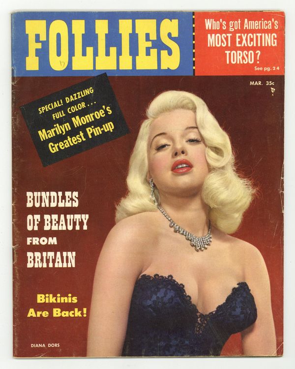 Volume 1, Issue 3 - March, 1956. Diana Dors cover and pictorial, Marilyn Monroe color centerfold. Vintage 50's era men's interest magazine featuring pin-ups of beautiful women in bikinis and lingerie. 8" x 10", 70 pages, B&W with color centerfold. Mature readers. Cover price $0.35.