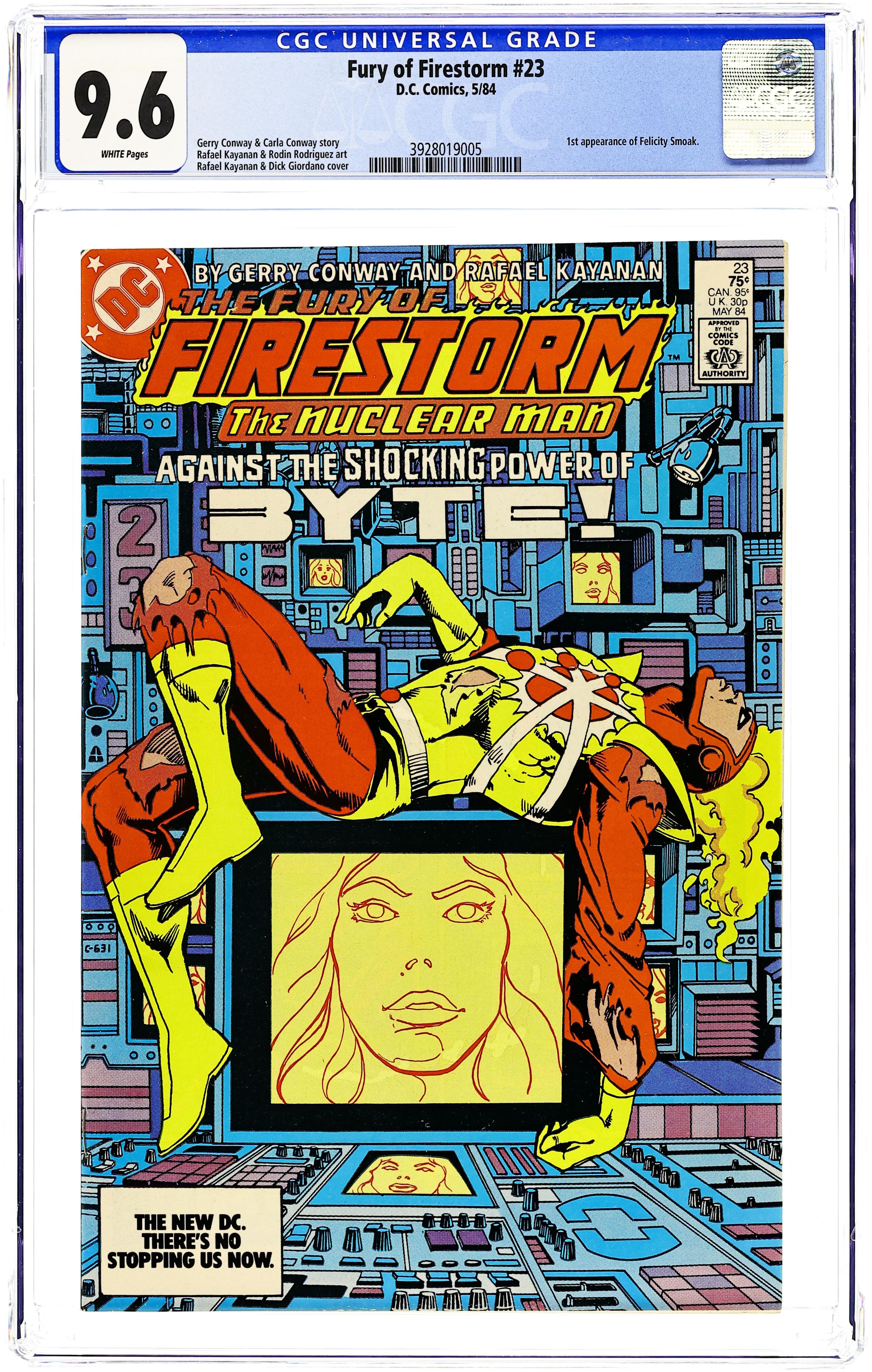 Ends Dec 8 8:22 PM CST Bid History 5 bids Current Bid $34 Your Secret Max Bid If you'd like to bid, please log in or register. First appearance of Felicity Smoak in Byte 1/2. Firestorm must contend with the electric menace calling herself Byte at the computer fair in "Byte". Part 1 of 2, continued next issue. Script by Gerry Conway, plot by Carla Conway, pencils by Rafael Kayanan, inks by Rodin Rodriguez. Firehawk. Cover price $0.75.